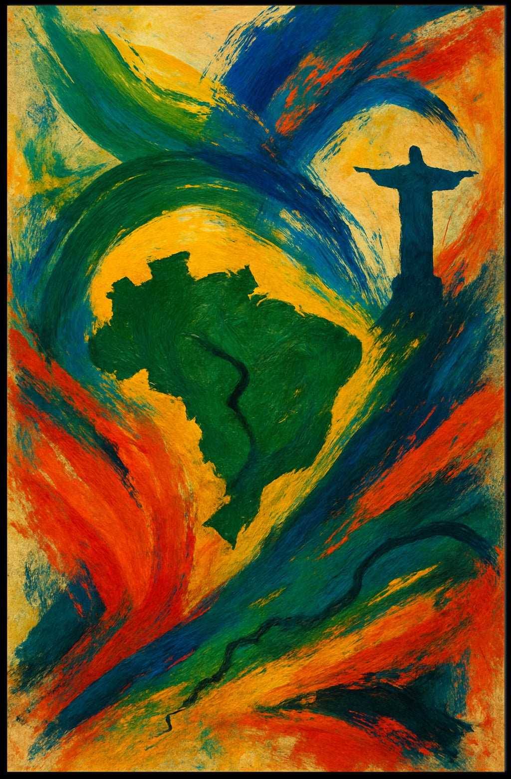 Infuse your walls with the energy of Rio and the soul of Brazil — the Vibrant Brazil Poster from PosterGoat is a striking pop-art inspired print that celebrates motion, color, and iconic imagery. Bold brushstrokes swirl in emerald greens, sunlit yellows, deep blues and fiery oranges to form the outline of Brazil with the silhouette of Christ the Redeemer rising in the composition, creating a dramatic focal point perfect for modern interiors and travel-inspired décor.