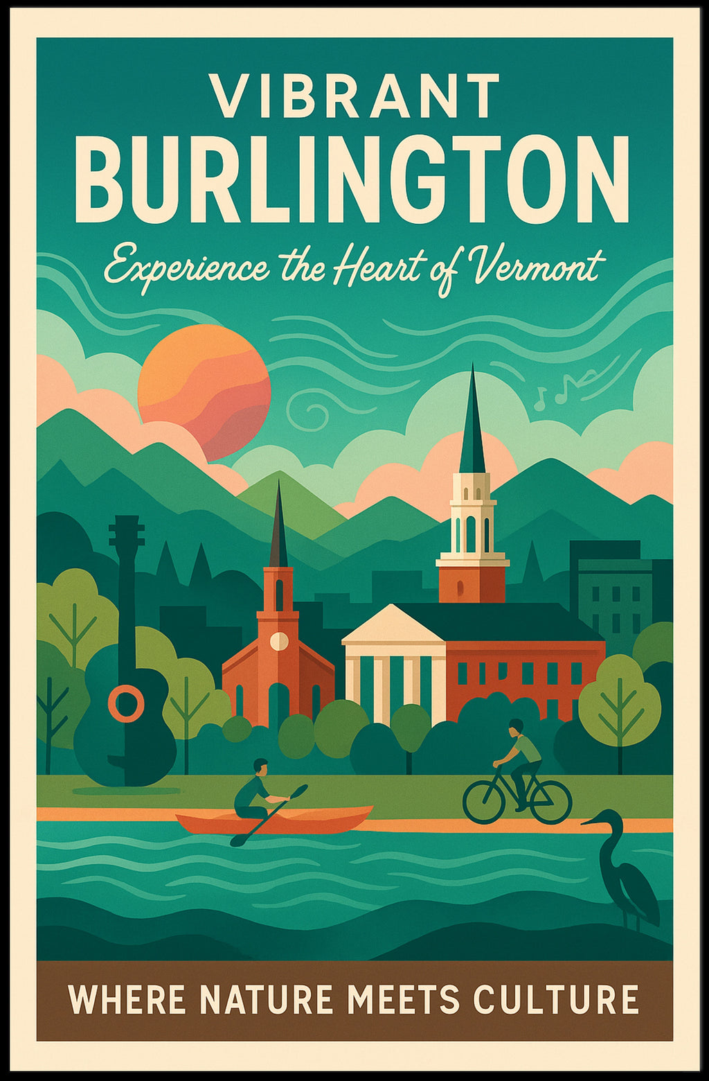 Bring the charm of New England into your home with the Vibrant Burlington Poster from PosterGoat — a vintage-inspired travel print that celebrates Burlington’s perfect blend of nature and culture. Rendered in a bold pop-art palette of teal, green and warm coral, this scenic poster features layered mountain silhouettes, iconic church steeples, a waterfront kayaker, a cyclist, a guitar motif and a watchful heron — all composed to evoke the heart of Vermont in a single eye-catching piece.
