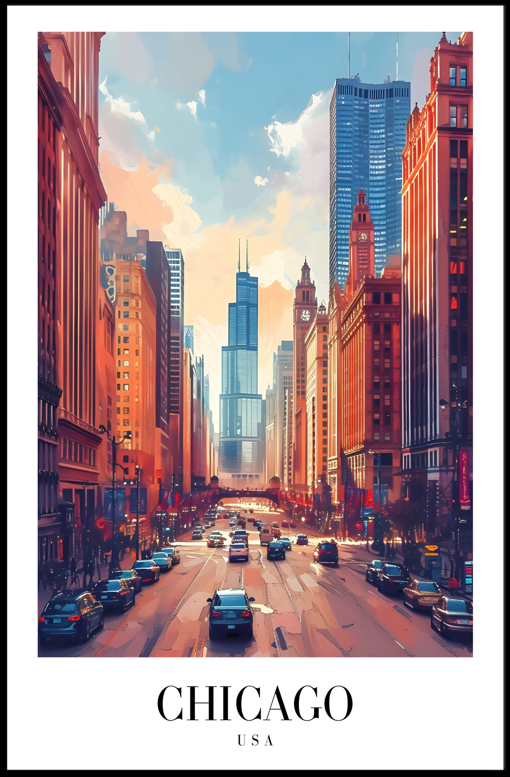 Capture the heartbeat of the Windy City. This Vibrant Chicago Cityscape with Iconic Skyline Urban Poster from PosterGoat transforms any wall with a dynamic street‑level view of downtown Chicago — sunlit skyscrapers, busy avenues, and the unmistakable layered skyline rendered in rich, pop‑art colors. The composition balances historic façades and modern towers, creating an energizing focal point for living rooms, offices, or gallery walls.