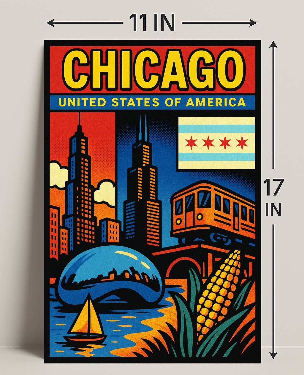 Printed with vivid, fade-resistant inks on premium poster stock, the Vibrant Chicago Poster delivers museum-quality color and crisp linework that hold up on display. Whether you're a local looking to showcase hometown pride or a traveler wanting a bold reminder of the Windy City's energy, this print is crafted to stand out.