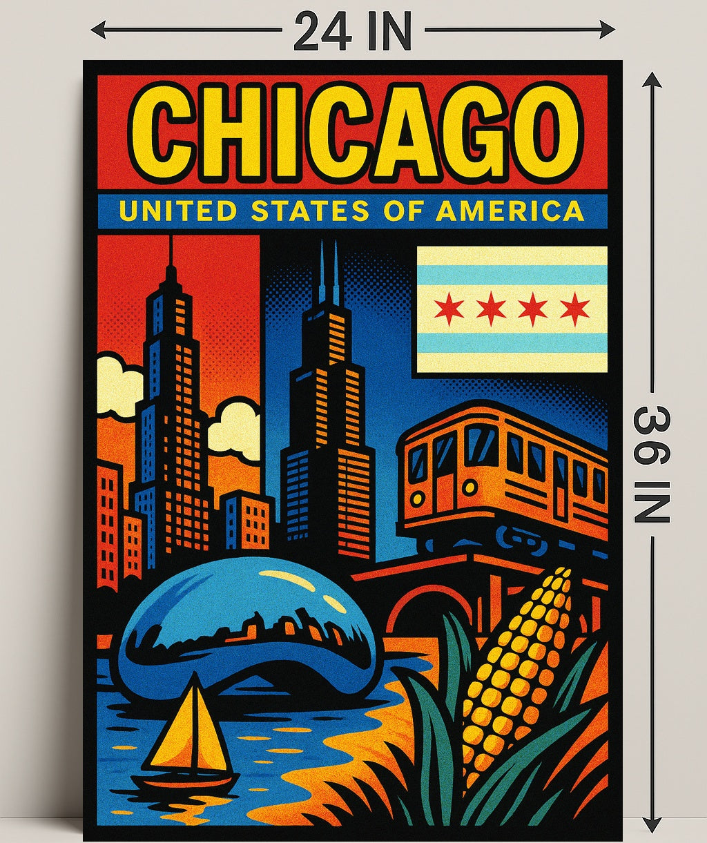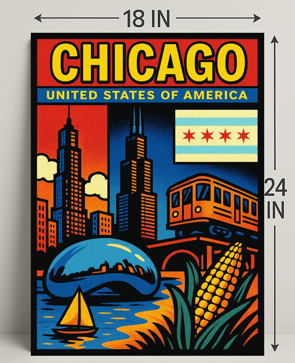 Bring Chicago home with bold color and retro pop-art flair. The Vibrant Chicago Poster from PosterGoat is a striking art print that celebrates the city's icons — the mirrored Cloud Gate "Bean," an elevated L train, the skyline punctuated by Willis Tower, a sailboat on shimmering water, and even a nod to the region with an illustrated corn ear — all framed beneath a vintage-style "CHICAGO" headline and the classic Chicago flag motif.