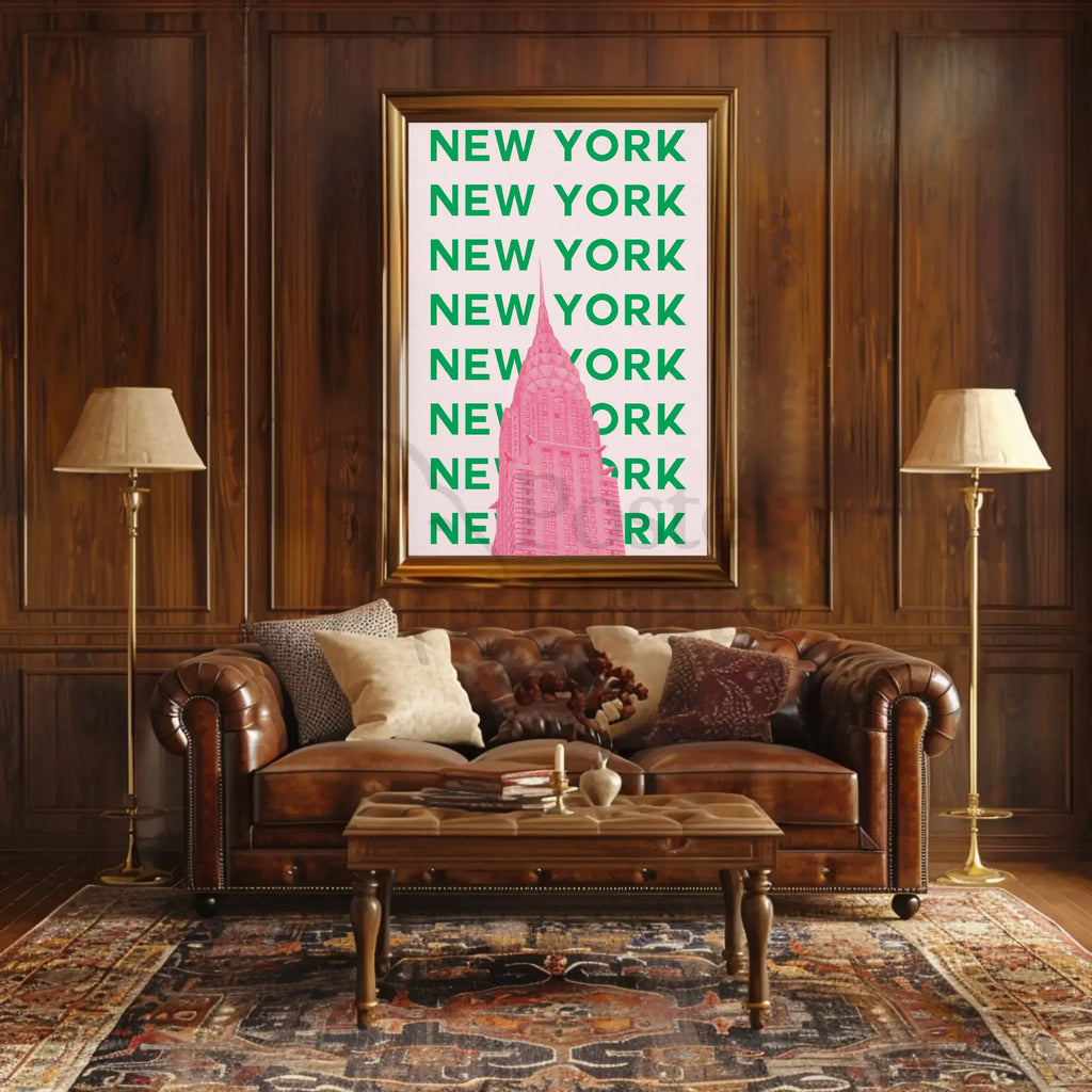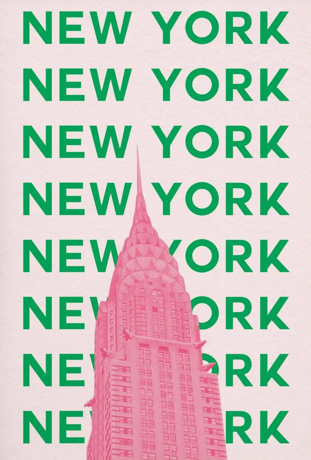 Striking color contrast: A monochromatic pink Chrysler Building silhouette pops against repeated, bold green "NEW YORK" typography for an eye-catching focal piece.