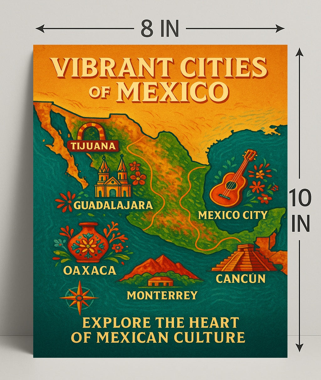 Eye-catching artwork: Retro pop-art style graphics that celebrate Mexico’s most beloved cities—Tijuana, Guadalajara, Mexico City, Oaxaca, Monterrey and Cancún—making a bold focal point in living rooms, offices or travel-themed spaces.