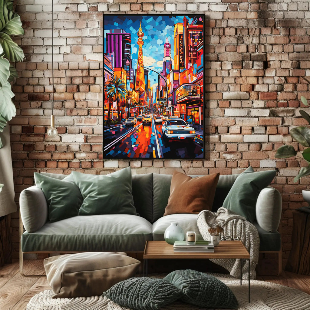 Perfect for modern decor, nightlife-themed rooms, and travel-inspired spaces, this 18x24 poster captures colorful buildings, bustling traffic, palm trees, and dazzling lights in a composition that feels both nostalgic and contemporary.