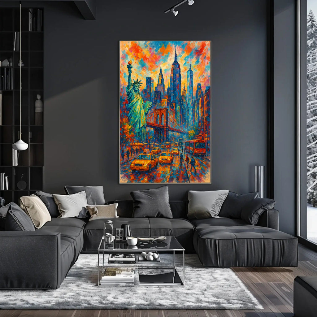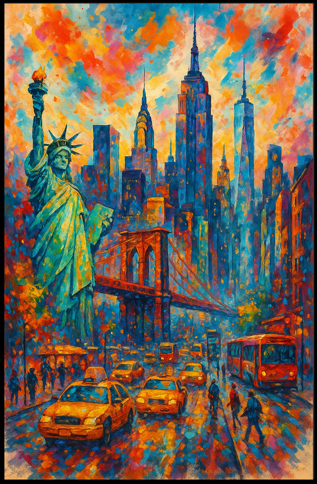 Intro: Experience the electric pulse of New York City with this vibrant, impressionistic poster. Luminous hues capture landmarks like the Statue of Liberty and the Brooklyn Bridge, while bustling streets and yellow taxis convey urban energy you can feel.