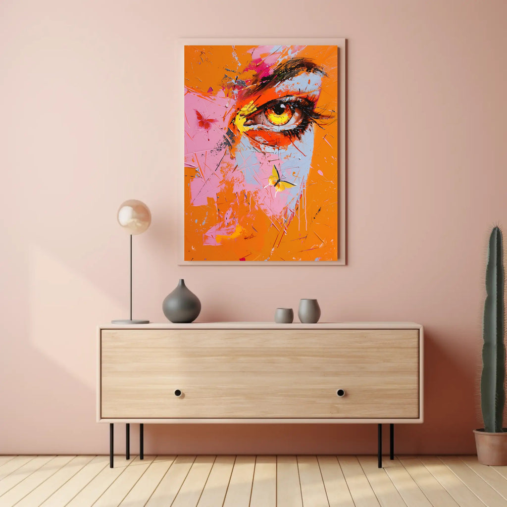 Infuse your walls with bold energy using the Vibrant Eye and Butterfly Composition Abstract Artistic Poster from PosterGoat — a striking contemporary poster that fuses pop-art flair with mid-century modern sensibilities. Vivid oranges, hot pinks and sunlit yellows collide in textured brushstrokes to form a stylized, watchful eye accentuated by delicate butterflies — an evocative centerpiece that sparks conversation and lifts any interior.