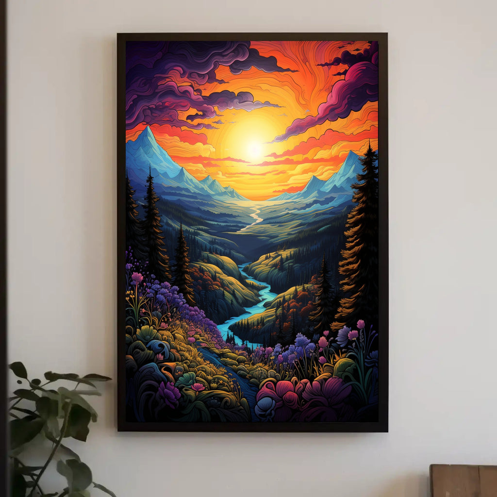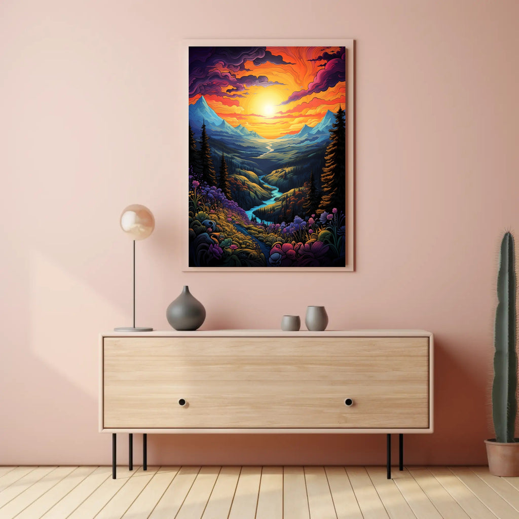Designed to inspire tranquility and curiosity, this landscape poster transforms plain walls into scenic escapes and pairs beautifully with minimalist décor or layered gallery walls. The energetic sunrise and calming valley balance excitement with serenity — a unique piece that invites lingering looks.