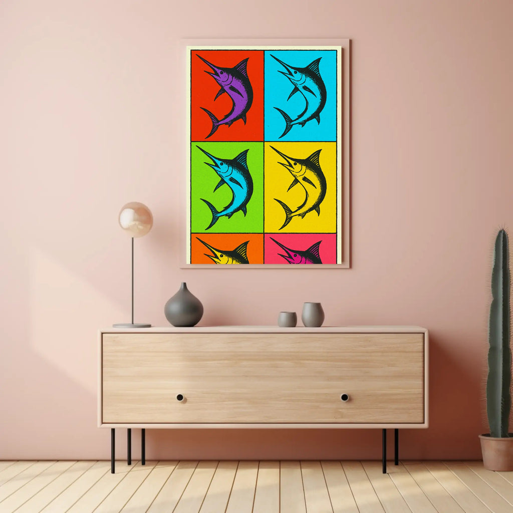 Bring ocean energy and bold color to your walls with the Vibrant Fish Pop Art Poster from PosterGoat. This eye-catching poster blends classic pop-art repeat imagery with a modern coastal twist — six stylized marlin illustrations arranged in a vivid grid of saturated panels that demand attention in any room.
