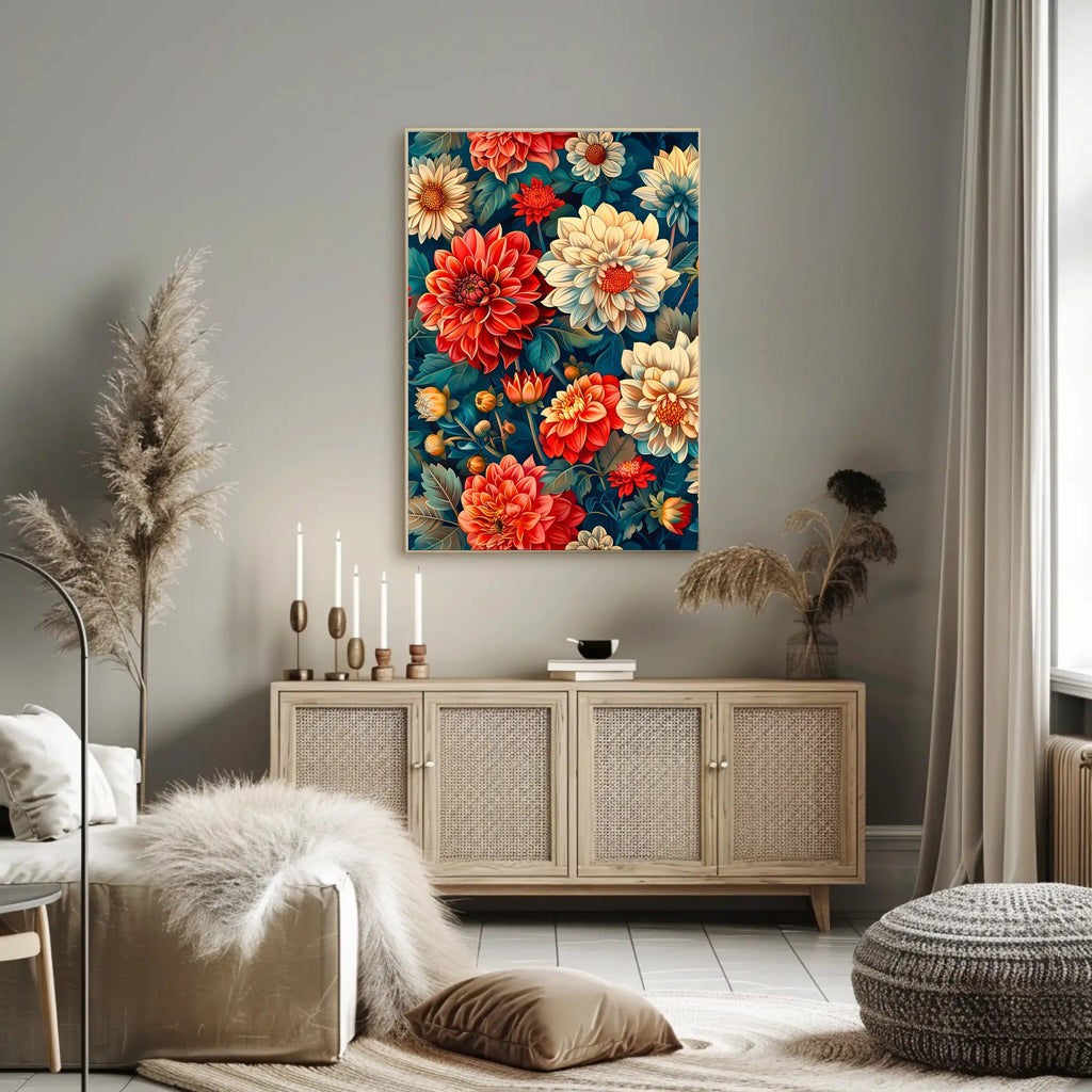 Benefits: Instantly uplifts neutral walls, serves as a conversation-starting focal point, and pairs beautifully with botanical or modern interiors. The bold floral design and lush garden motif make it an excellent choice for styling living rooms, entryways, or creative studios.