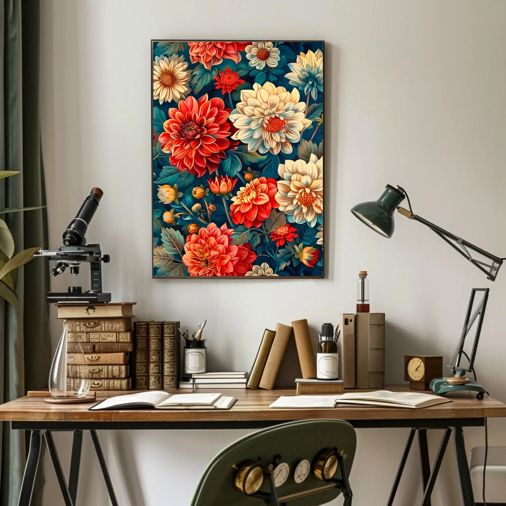 Bring a lush, gallery-quality focal point to any room with the Vibrant Floral Garden Artistic Masterpiece Poster by PosterGoat. This striking floral poster blends bold pop-art energy with delicate botanical detail — rich red and cream blooms float against a deep teal backdrop, accented by layered green leaves for depth and contrast. Perfect for living rooms, bedrooms, or office walls, this artful print transforms ordinary spaces into vibrant nature-inspired displays.