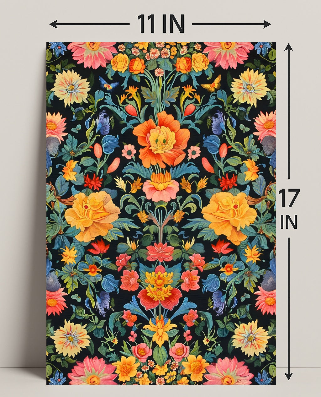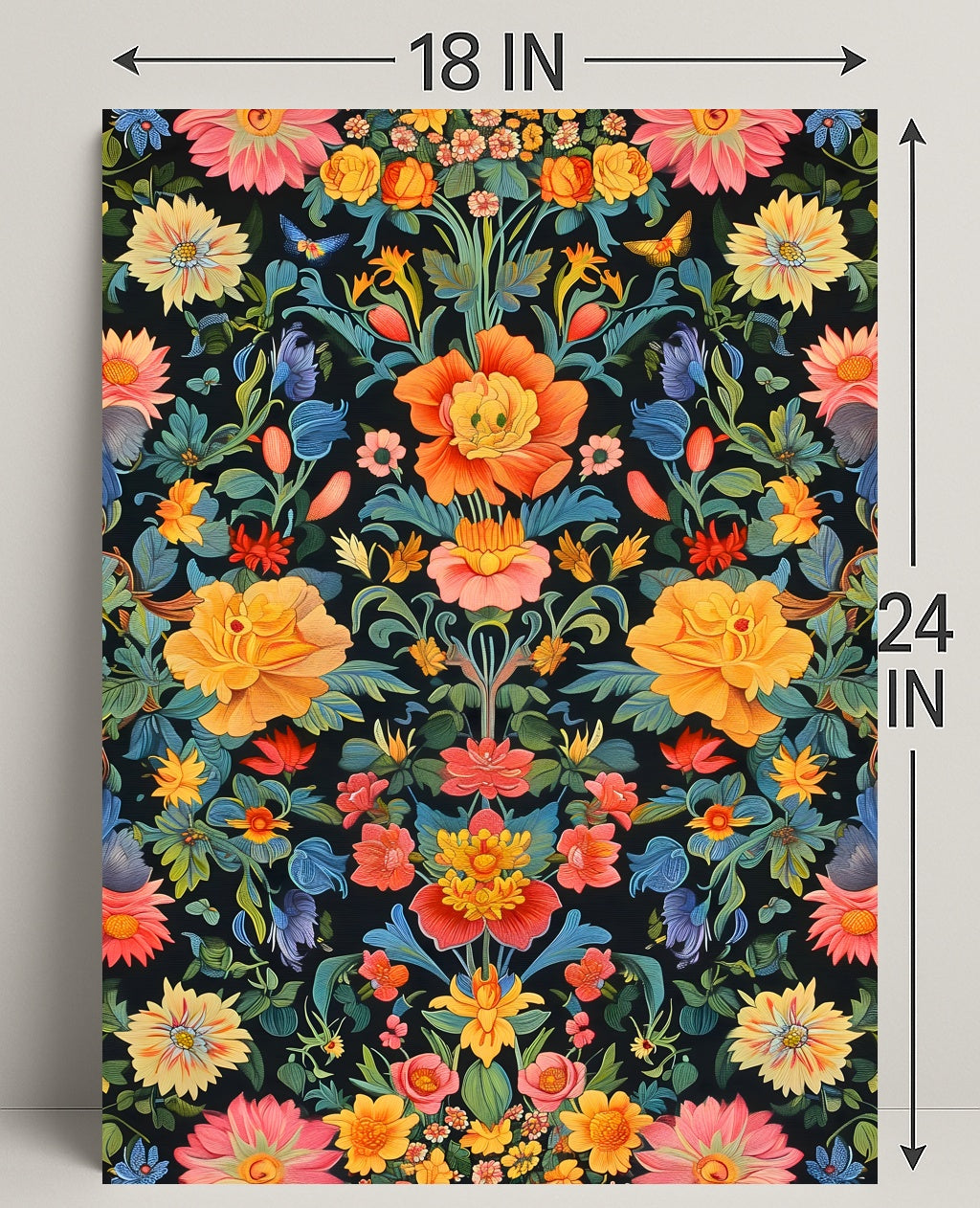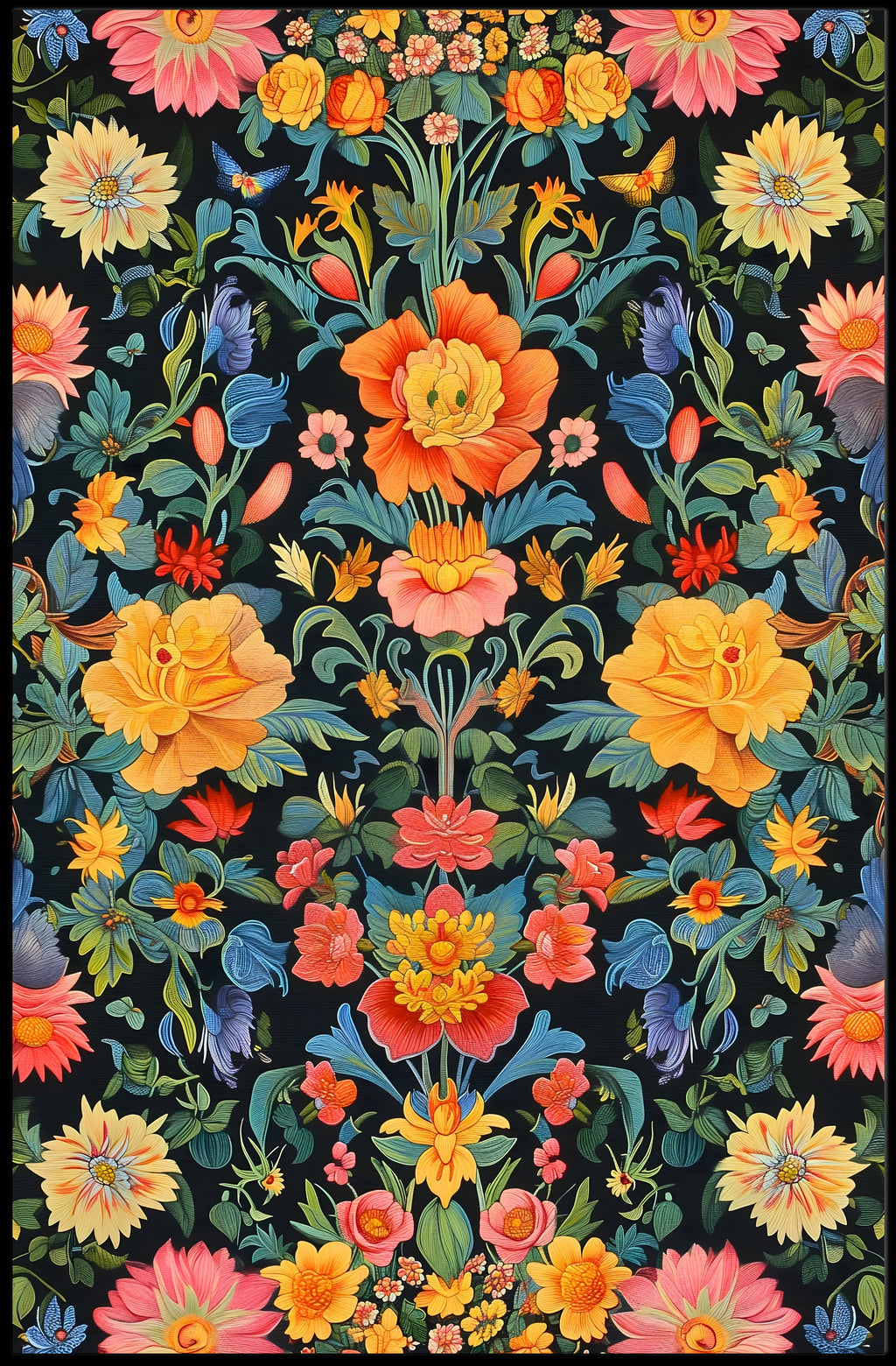 Bring the timeless beauty of classic textile design into your home with the Vibrant Floral Tapestry William Morris Art Poster from PosterGoat. This richly detailed wall art captures a lush, symmetrical bouquet of blossoms rendered in jewel-bright tones against a deep, dramatic background—perfect for adding warmth and personality to living rooms, bedrooms, or hallway galleries.
