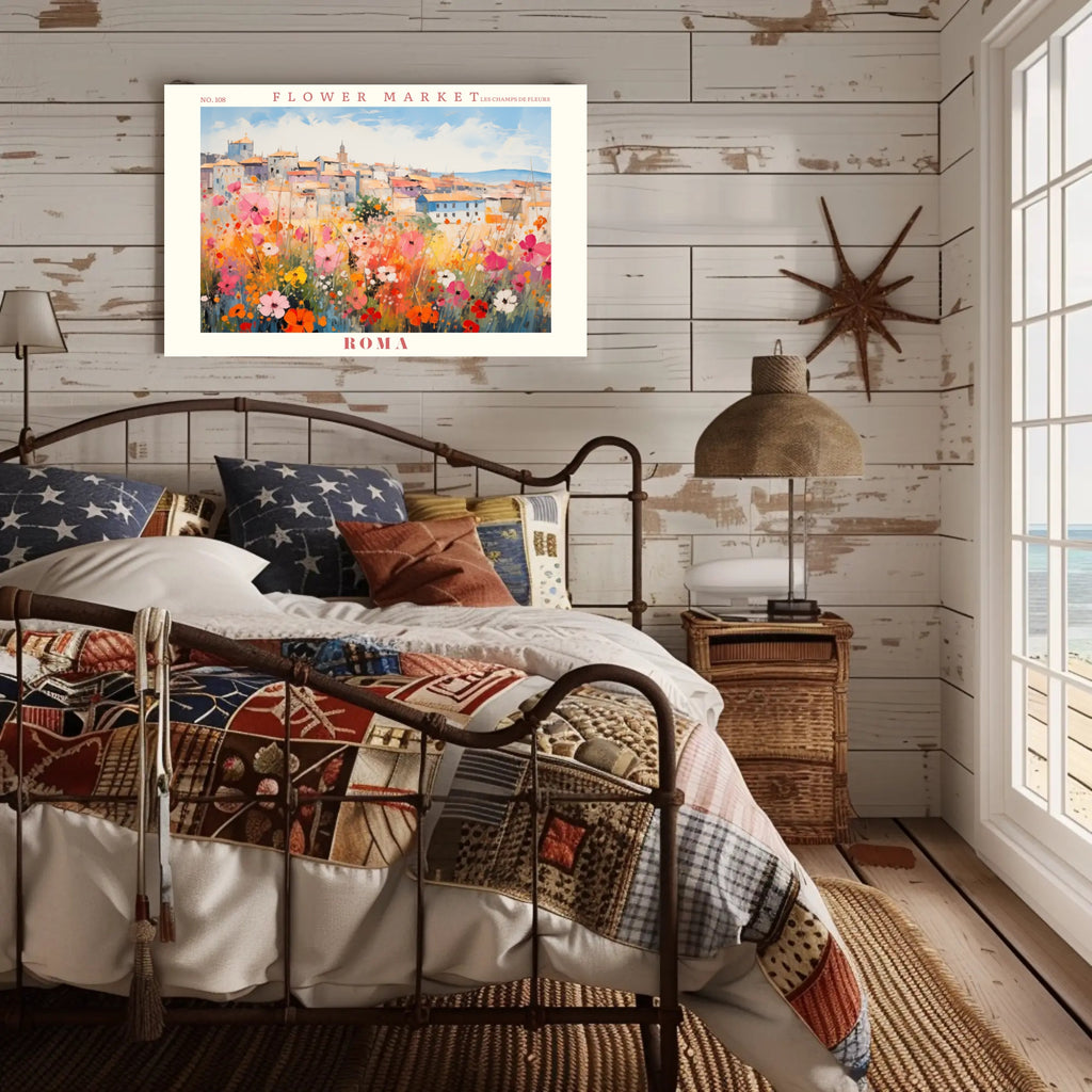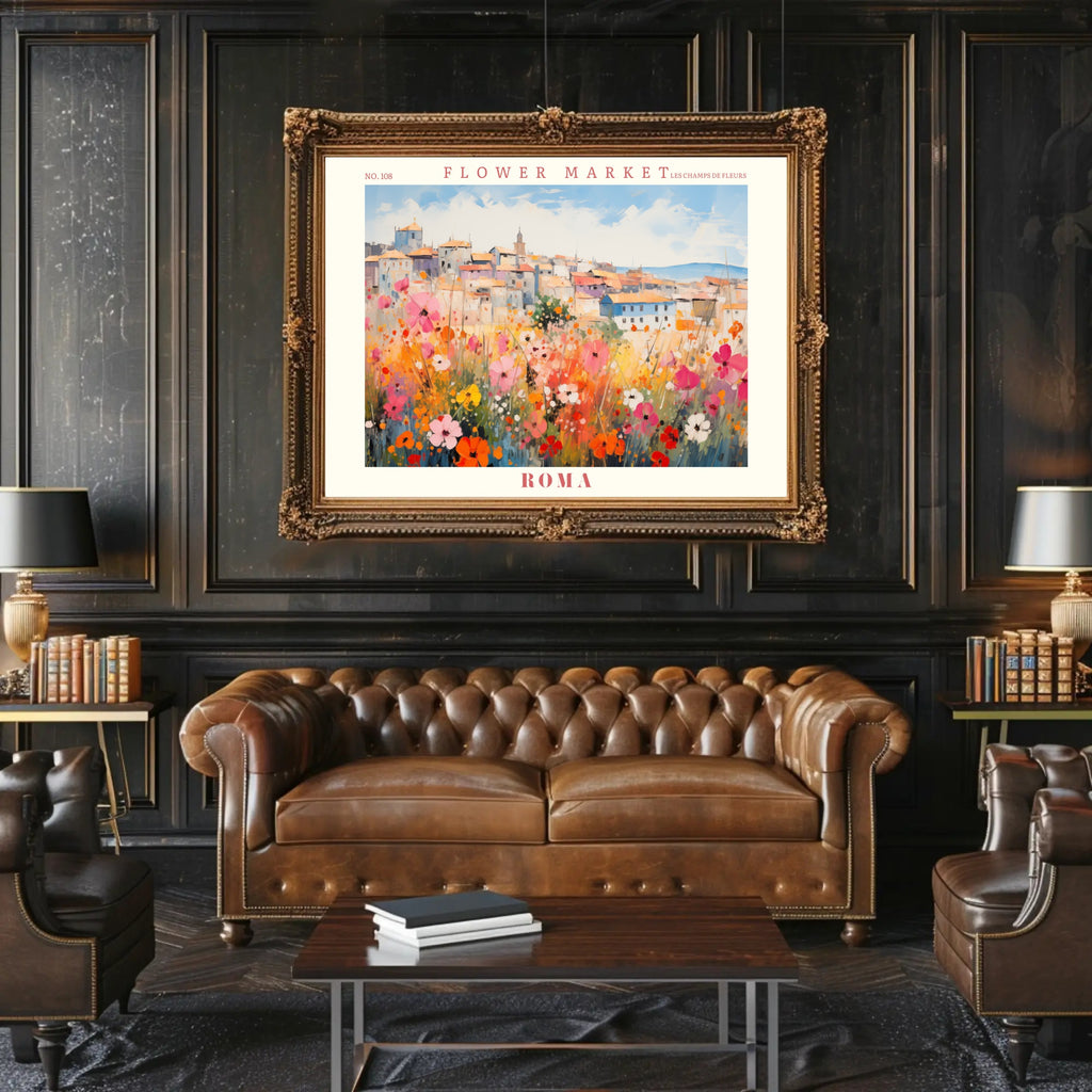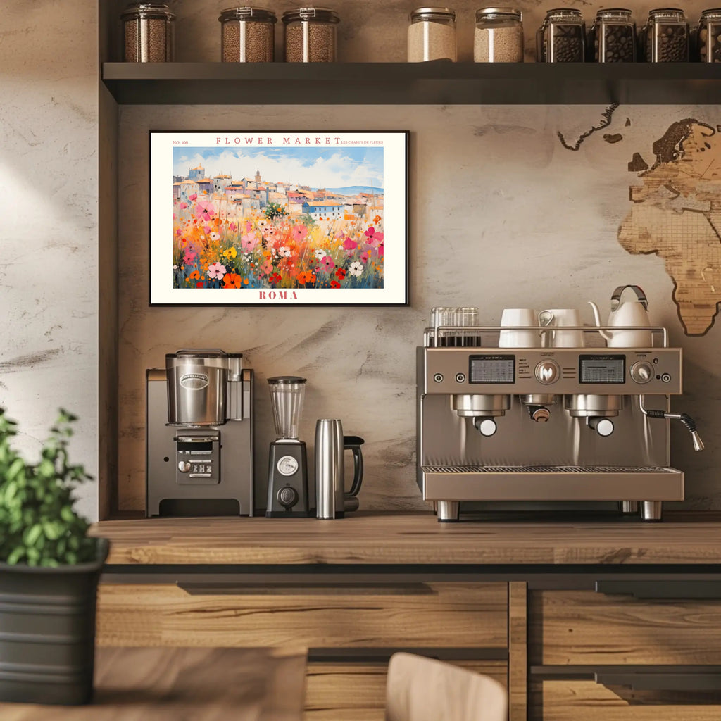 Bring the sun-drenched charm of an Italian flower market into your home with the Vibrant Flower Market in Italy Travel Poster from PosterGoat. This impressionistic poster captures a lively Roma scene: a coastal town skyline softened by painterly brushstrokes and a foreground exploding with pink, orange, yellow and white blooms that create energy and warmth in any room.