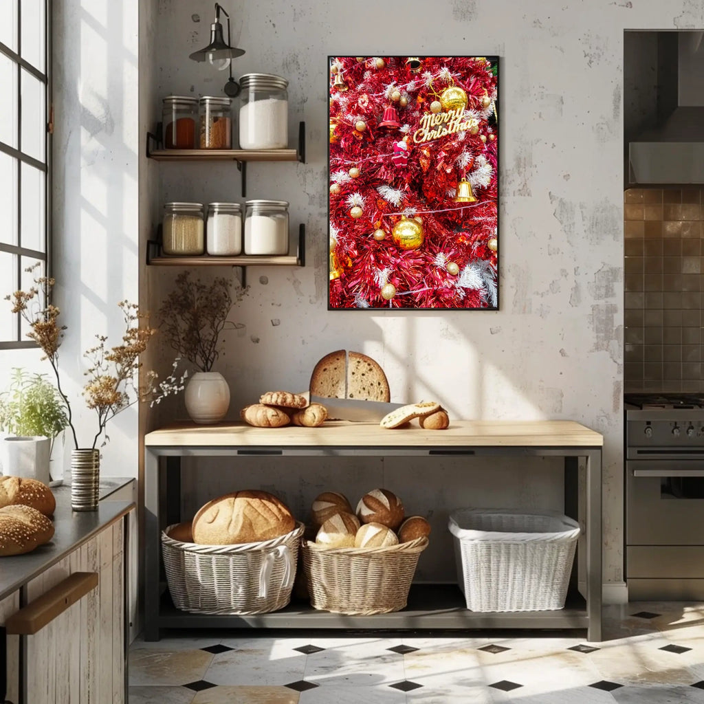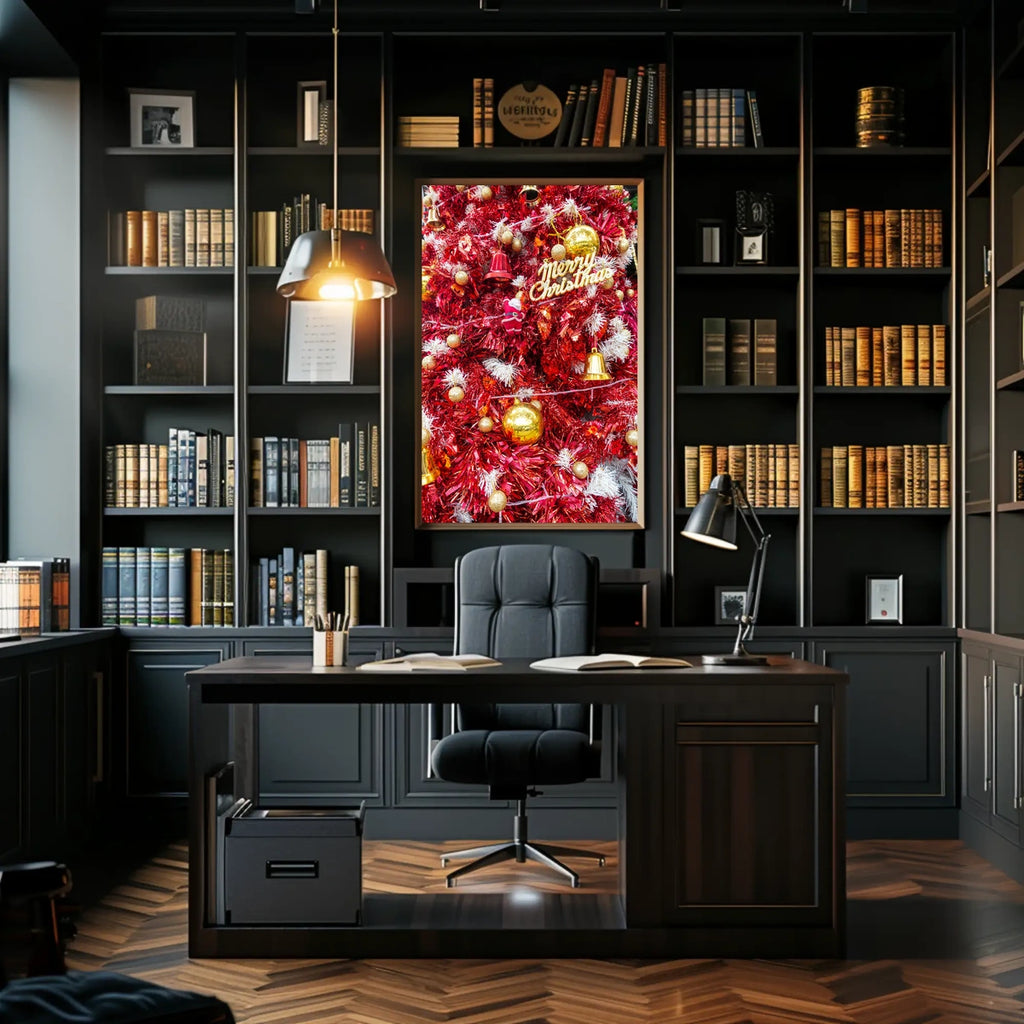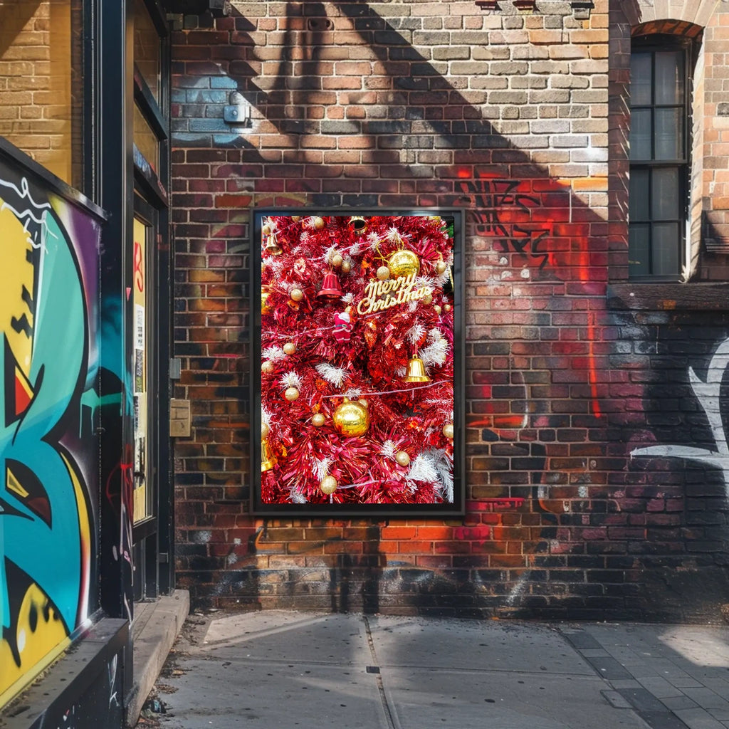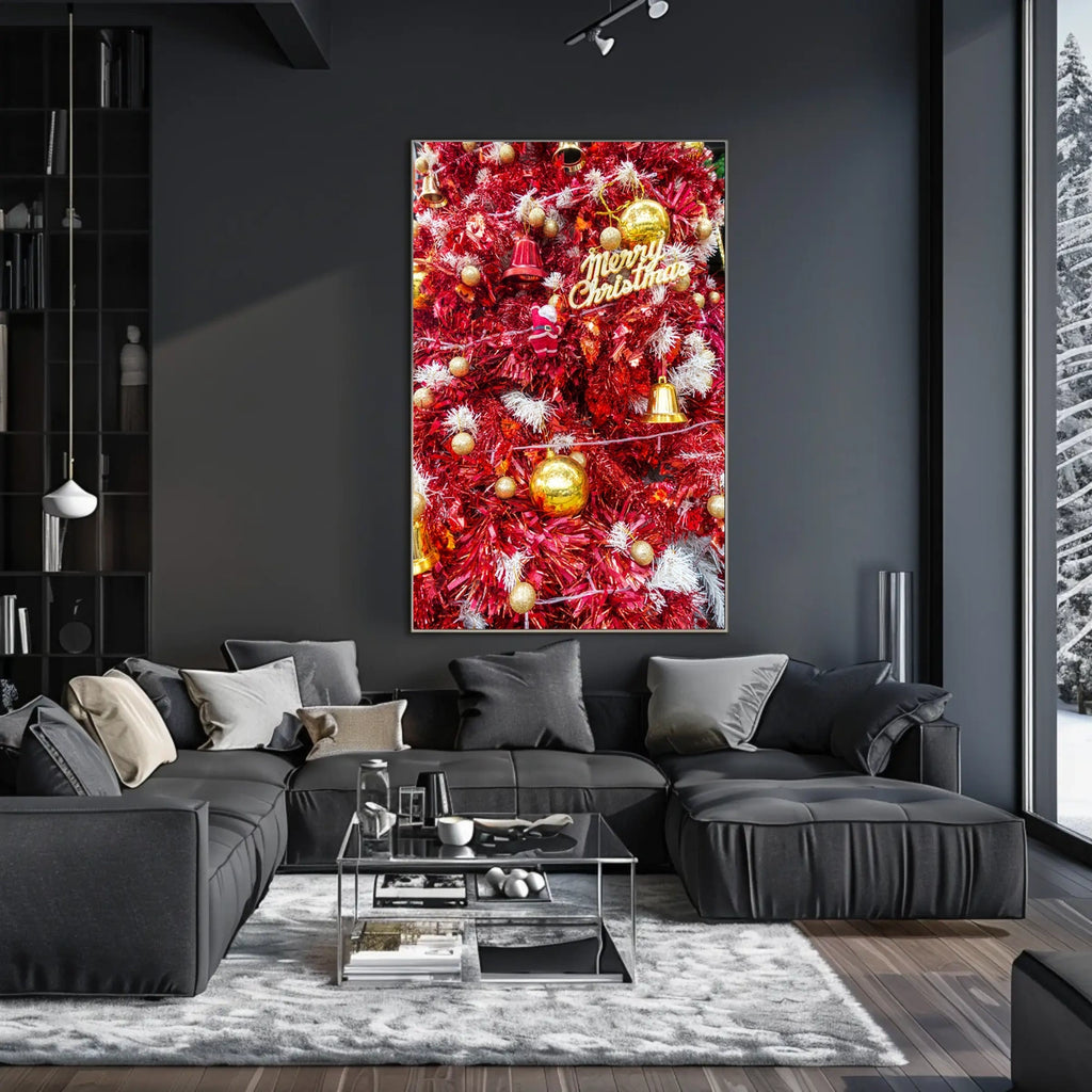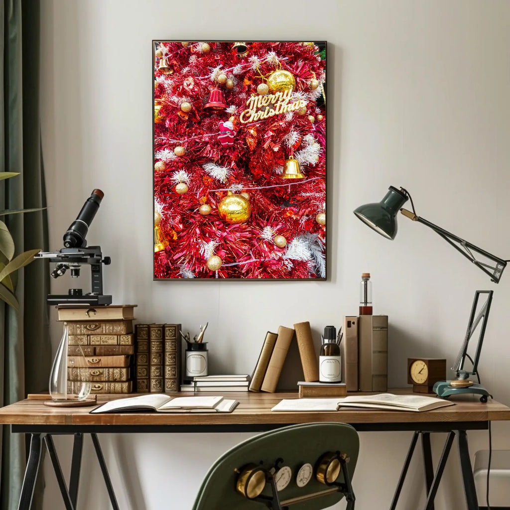 Celebrate the warmth and joy of the holiday season with the Vibrant Holiday Christmas Tree Festive Celebrations Poster. This lively Christmas poster features a modern, vibrant close-up of a Christmas tree adorned with colorful decorations. The primary color scheme of red, gold, and white creates a cheerful atmosphere, underscored by shiny baubles, golden bells, and a charming Santa Claus ornament. The vivid red and white tinsel adds sparkle, while a prominent golden "Merry Christmas" ornament offers a beautiful festive greeting. Perfect for adding cheer to any space, this poster embodies the essence of holiday celebrations.