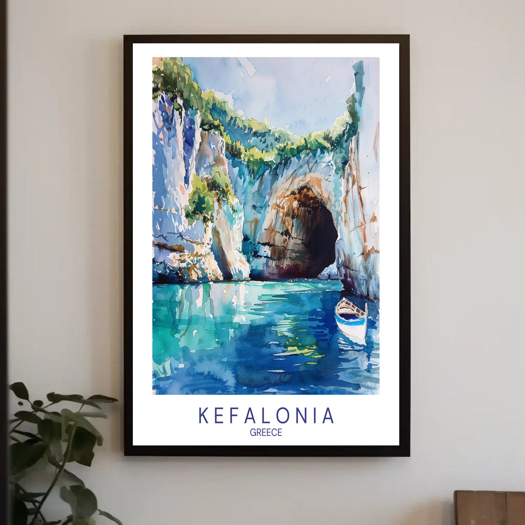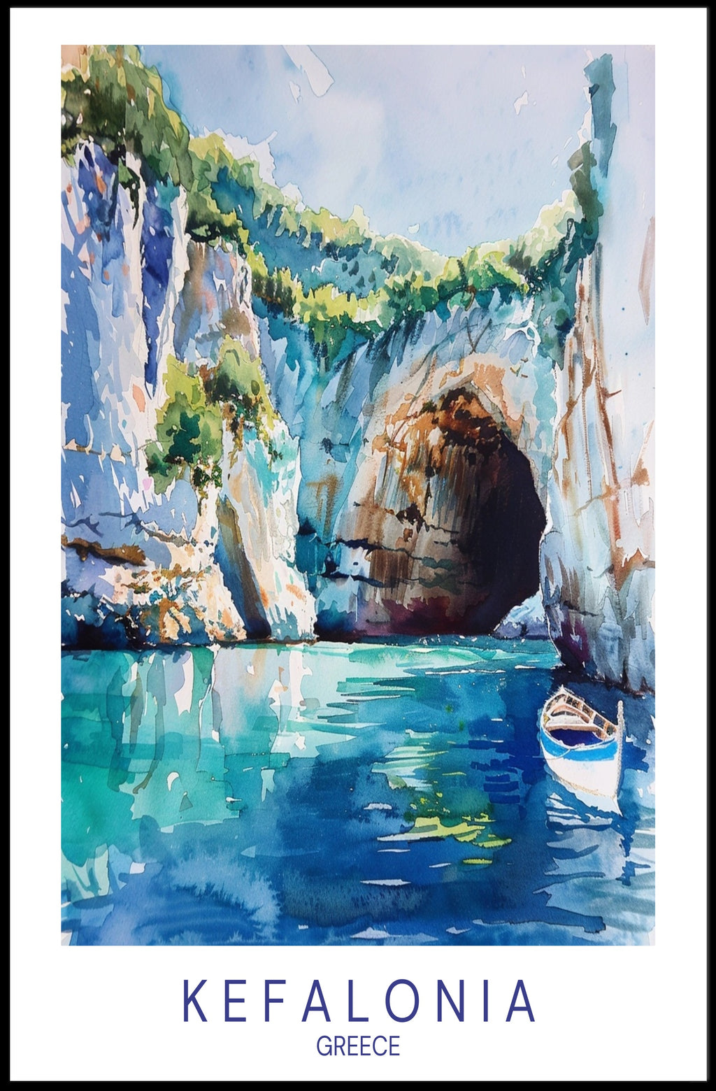 Bring the sun-drenched charm of Kefalonia into your home with this Vibrant Kefalonia Coastal Scene Watercolor travel poster from PosterGoat. Painted in luminous watercolor washes, the artwork captures towering limestone cliffs draped in lush greenery, a tranquil turquoise cove and a solitary white-and-blue boat gently mirrored in crystalline waters — a perfect piece of Greek island art for any wall.