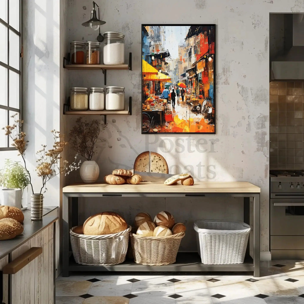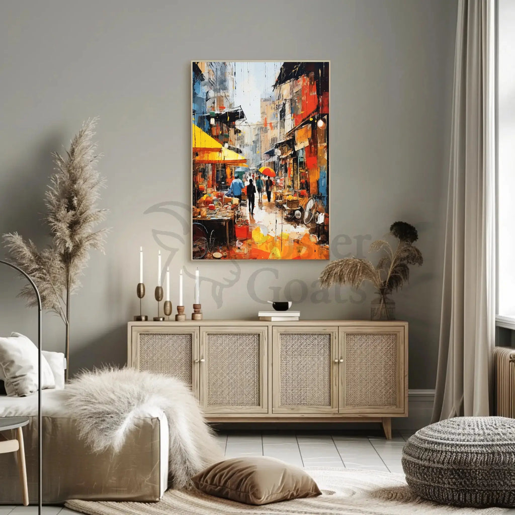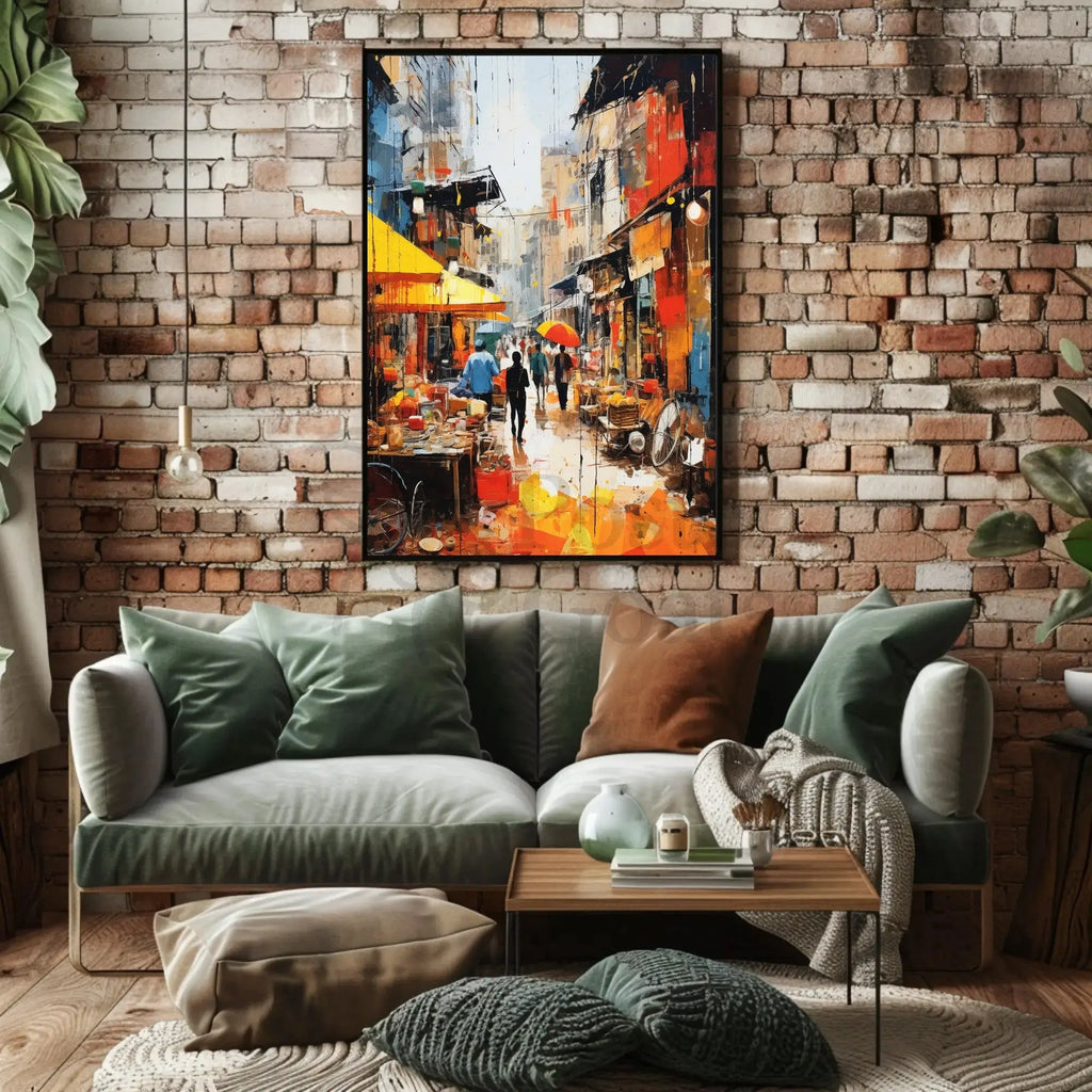 This poster works beautifully as a standalone focal point or layered within a curated gallery wall. The lively street scene, busy market stalls and impressionistic brush strokes make it an engaging conversation starter that transports viewers to a vibrant urban market.