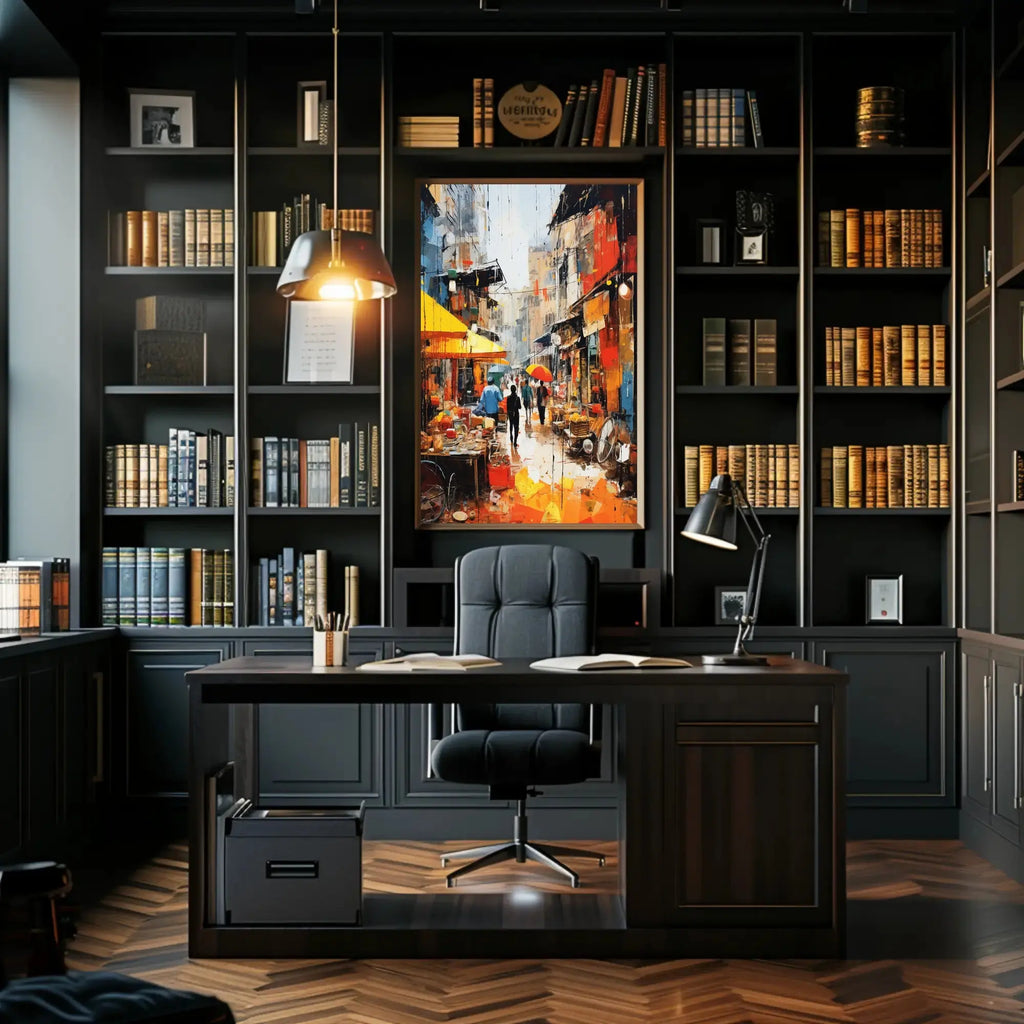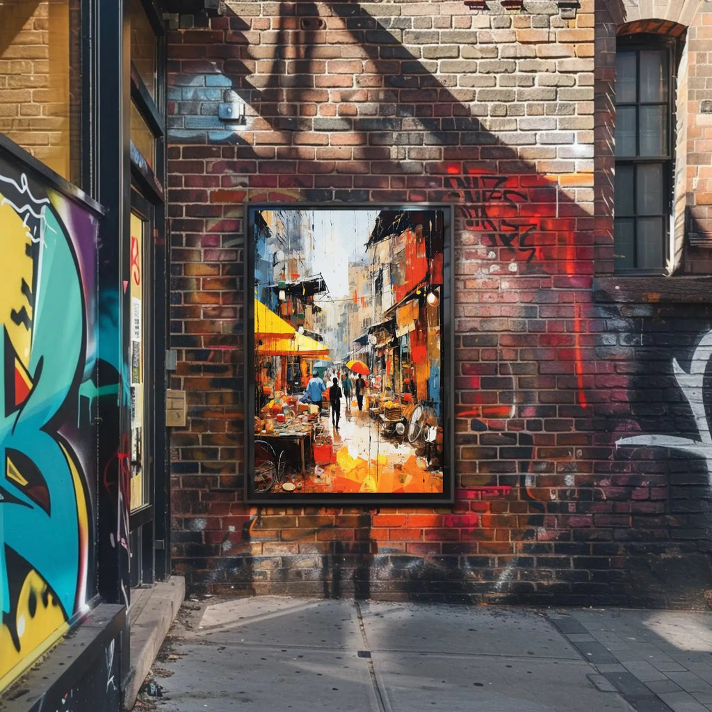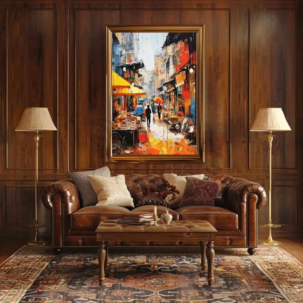 This poster works beautifully as a standalone focal point or layered within a curated gallery wall. The lively street scene, busy market stalls and impressionistic brush strokes make it an engaging conversation starter that transports viewers to a vibrant urban market.