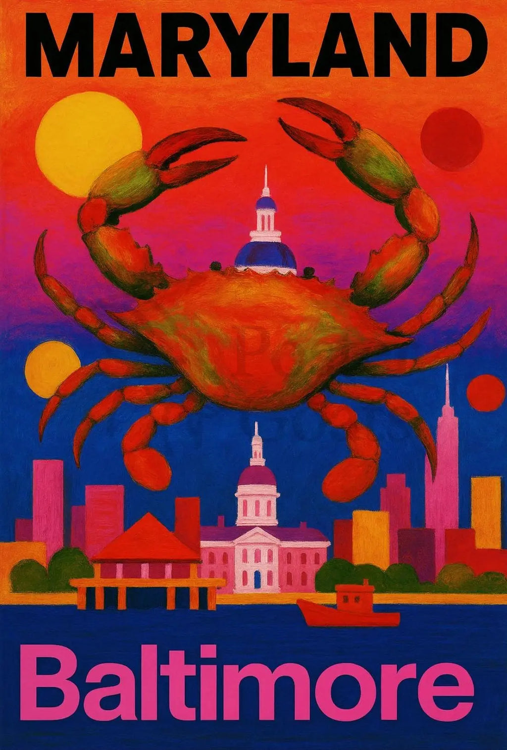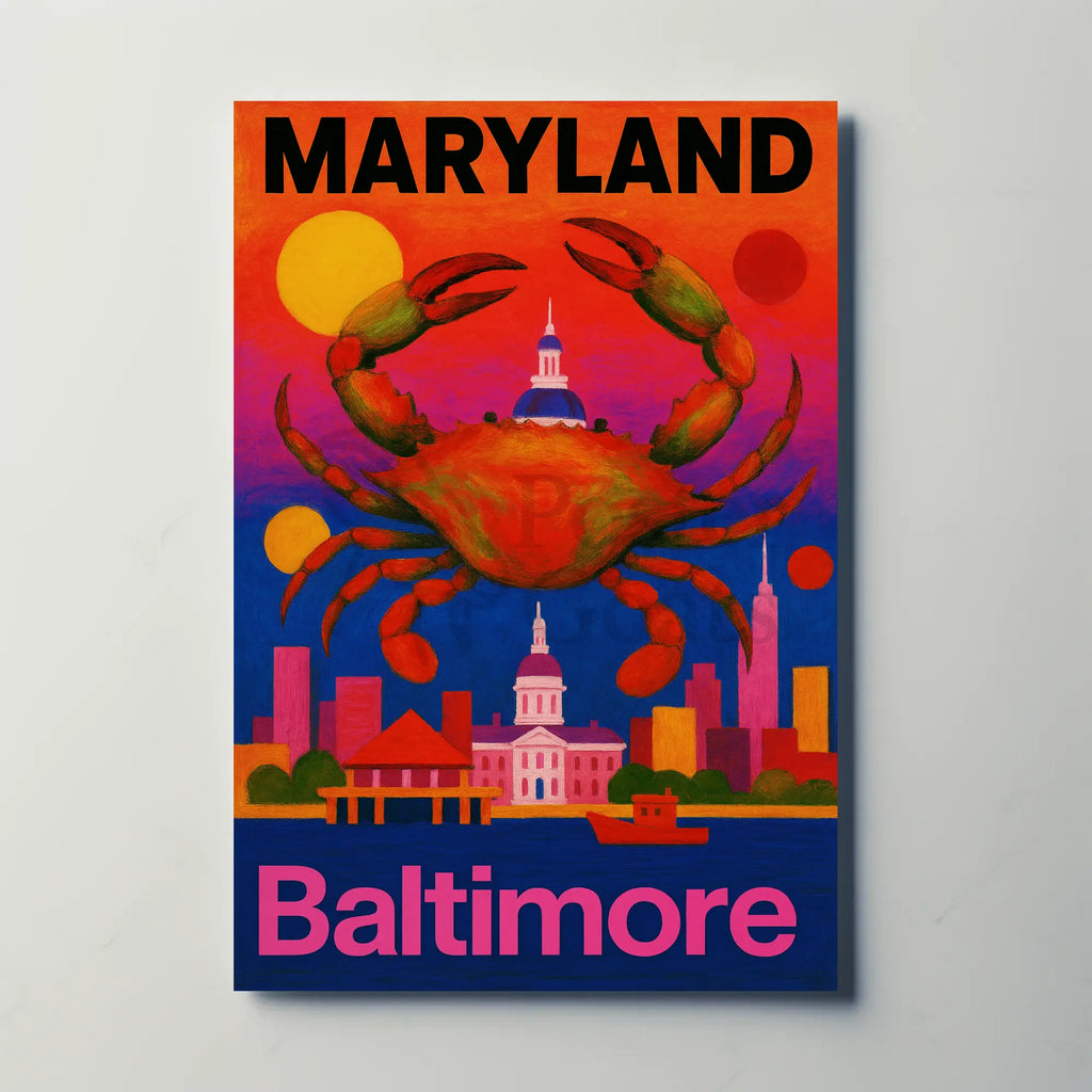 This poster is categorized under Home & Garden > Decor > Artwork > Posters, Prints, & Visual Artwork > Posters and is ideal for anyone seeking colorful cityscape art or Baltimore-themed decor. The large, legible "MARYLAND" and "Baltimore" type combined with the playful crab illustration makes it an unmistakable statement piece and a great conversation starter.