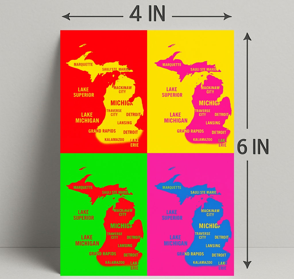 Bring Michigan to life with the Vibrant Michigan Map Poster from PosterGoat — a pop-art inspired wall print that transforms any room with bold color blocks, playful typography and a modern map layout. This eye-catching poster highlights Michigan's shape and major cities in a four-quadrant design that doubles as both a geographic reference and a striking piece of contemporary artwork.