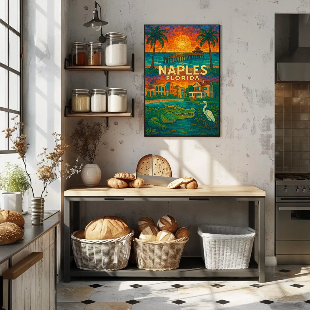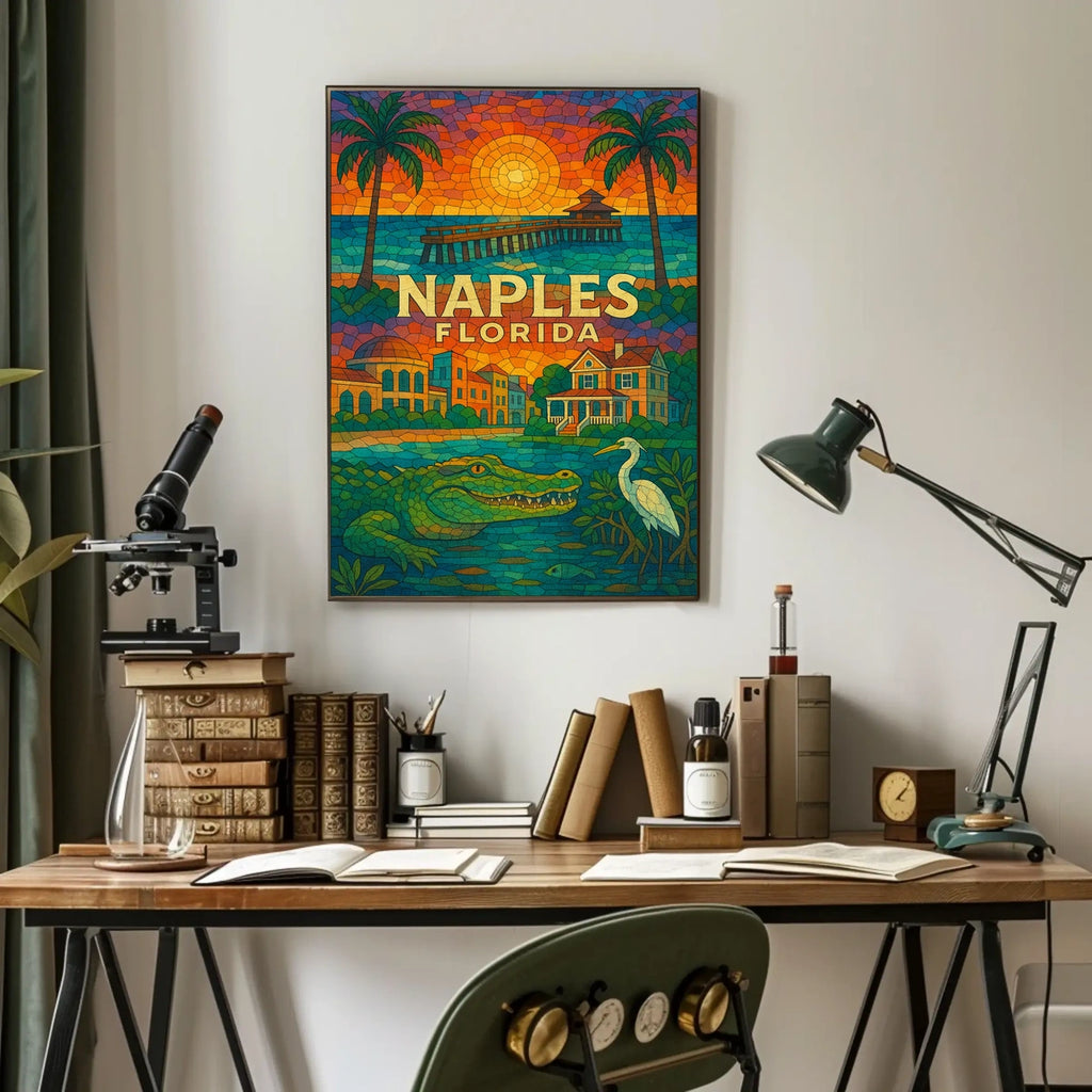 Celebrate the sunny charm of Naples, Florida with this vibrant mosaic poster. It captures the coastal paradise—swaying palm trees, a sunset pier, historic architecture, and wildlife—offering a lively centerpiece for any room.