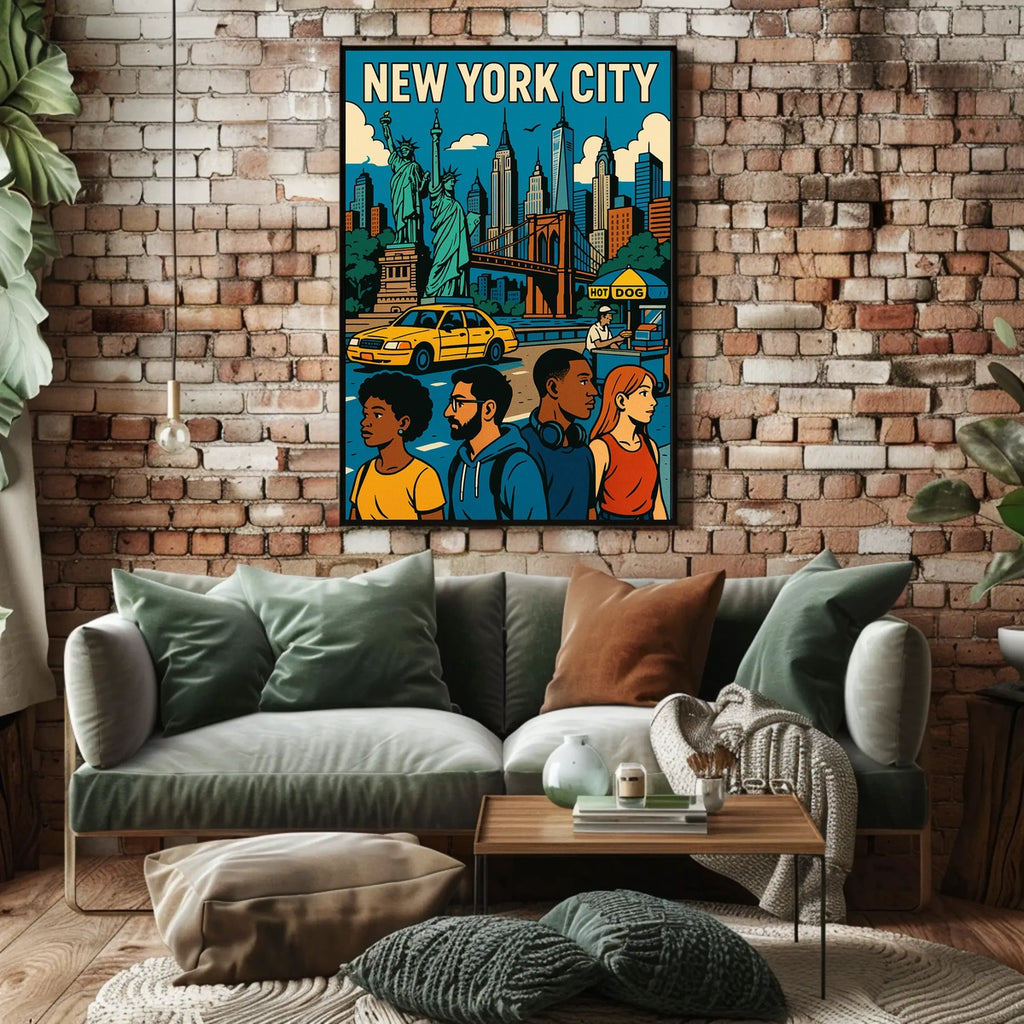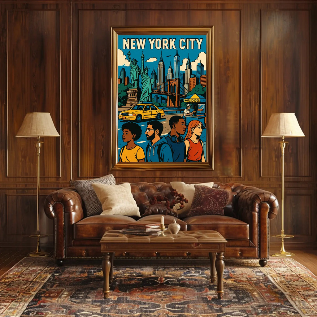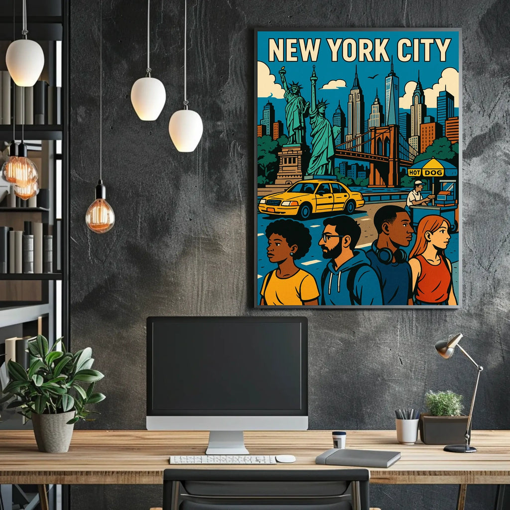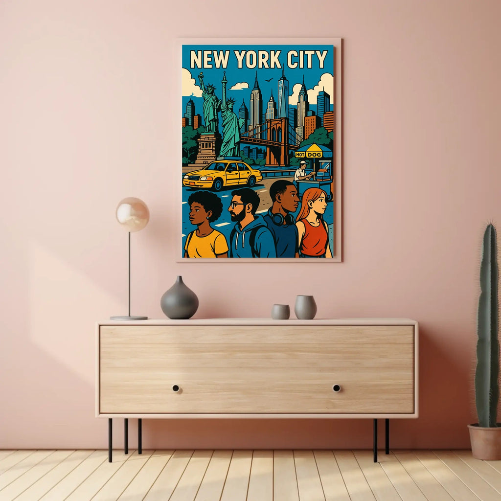Immerse yourself in the vibrant energy of New York City with this striking poster. The artwork blends iconic landmarks with lively urban life, delivering a bold centerpiece that brightens any space with culture, color, and cosmopolitan charm.