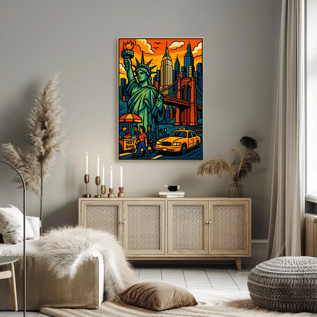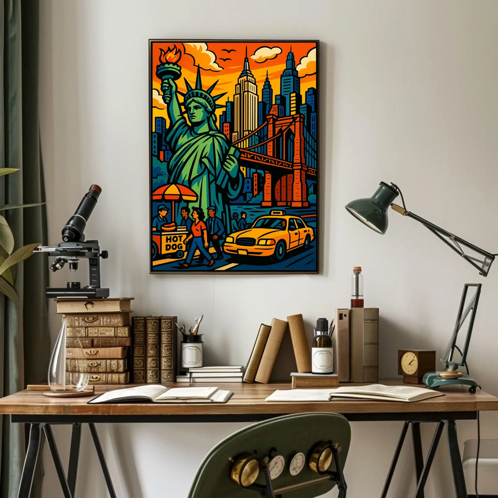 - Iconic Landmarks in one composition: Statue of Liberty, Empire State Building, and Brooklyn Bridge fuse instantly recognizable NYC vibes, creating a bold focal point.