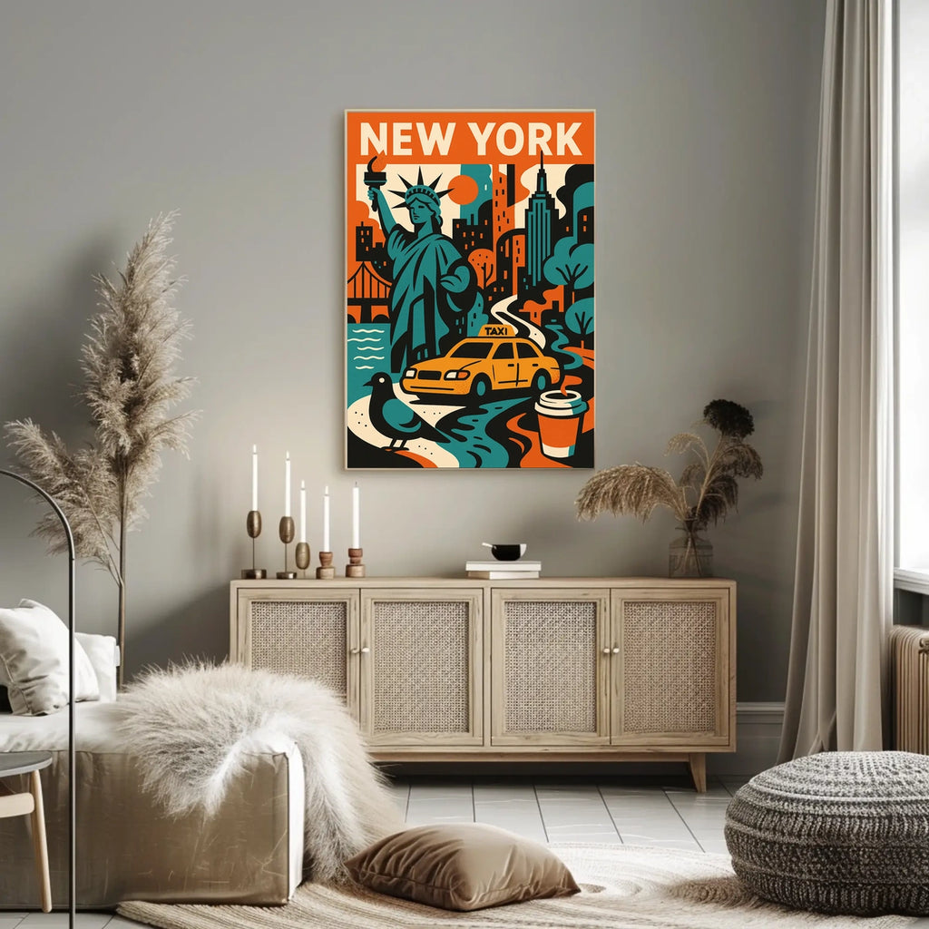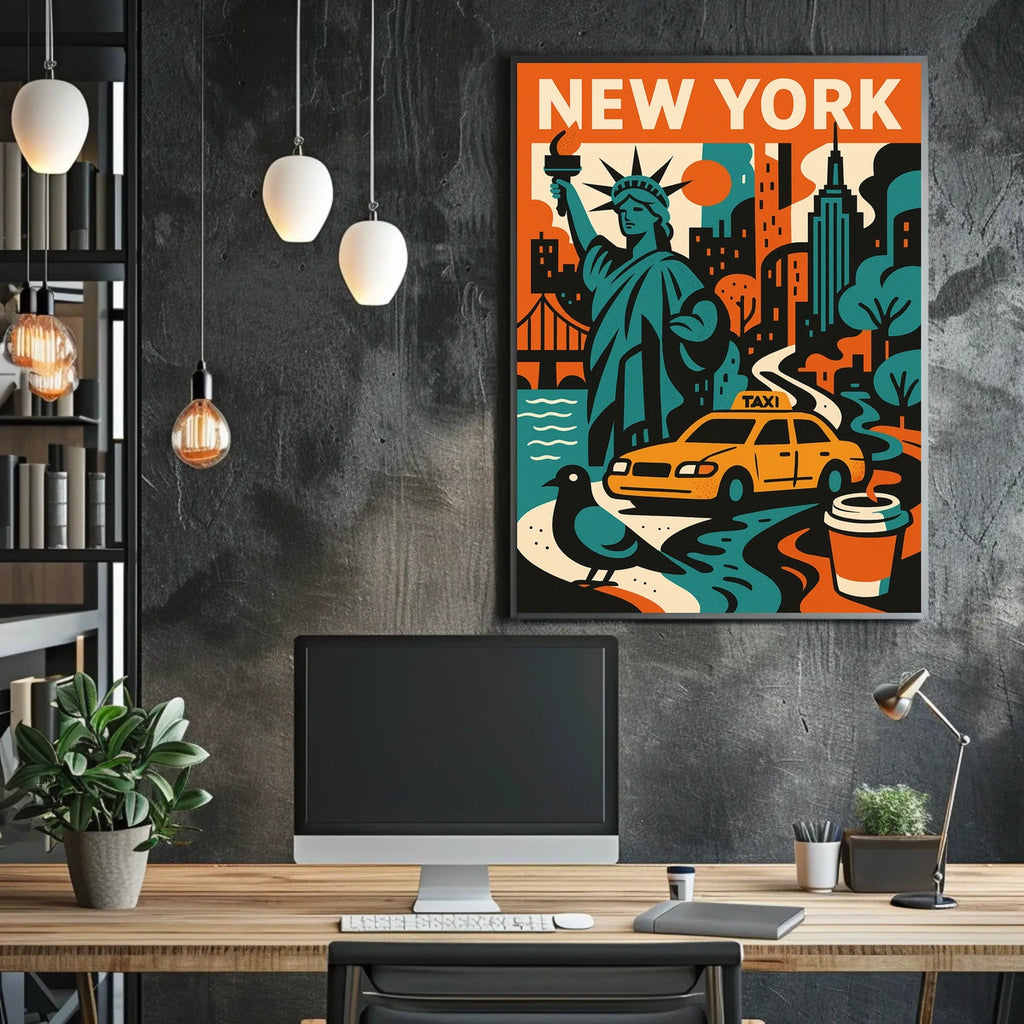 Intro: This colorful poster captures the essence of New York City with iconic elements like the Statue of Liberty, a yellow taxi, and a bustling skyline. The bold, retro-inspired design highlights the city’s dynamic energy and cultural landmarks, making it a perfect tribute to the Big Apple for any wall.