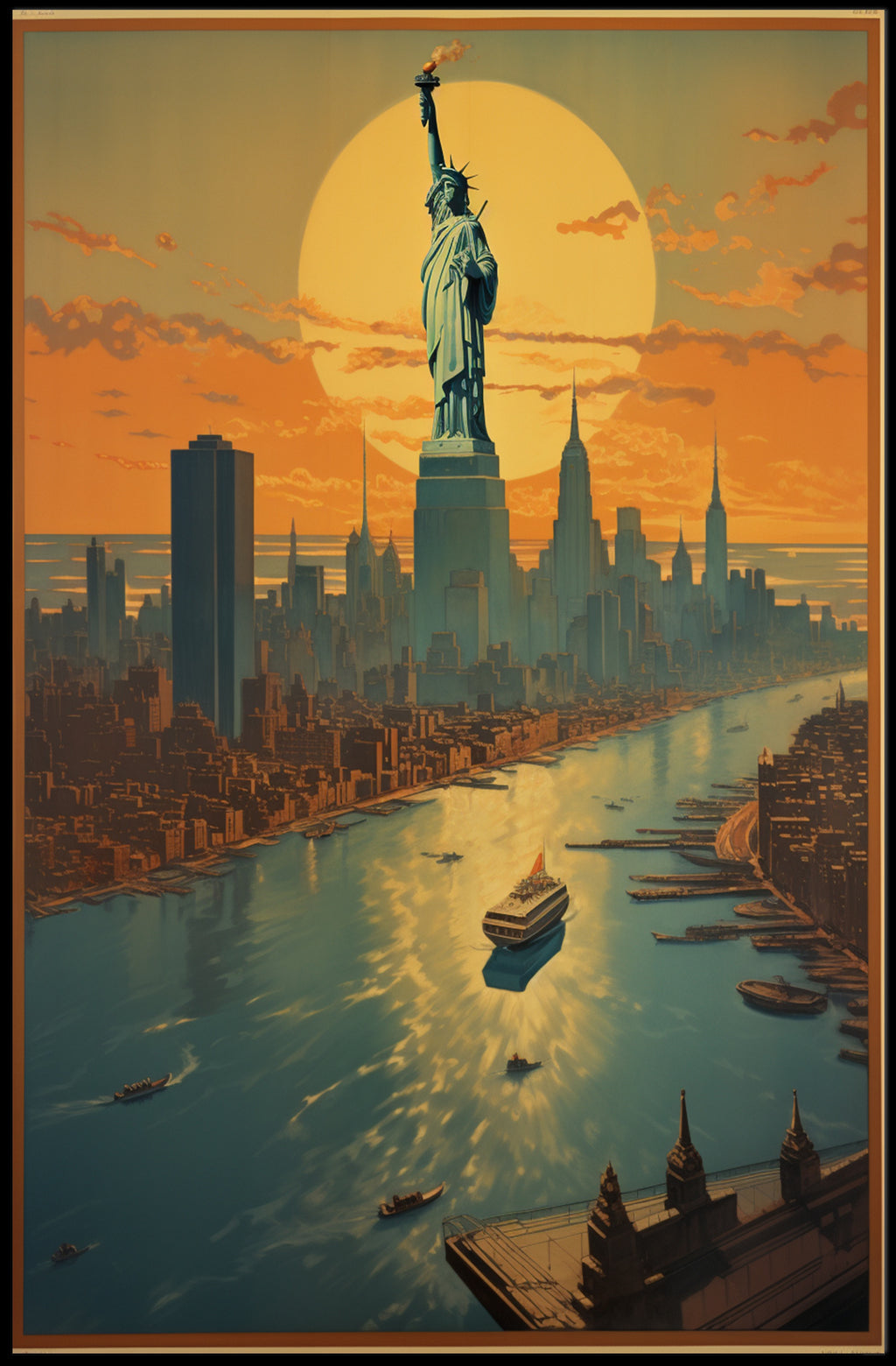 Bring the magic of Manhattan into your home with this Vibrant New York City Sunset Urban or Cityscape Poster from PosterGoat — a bold, mid-century modern inspired print that celebrates the Statue of Liberty, a glowing sunset, and the shimmering Hudson River in one dramatic composition.