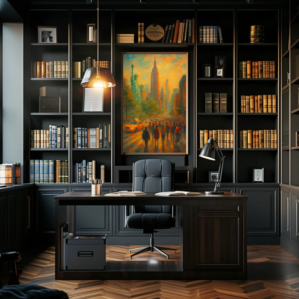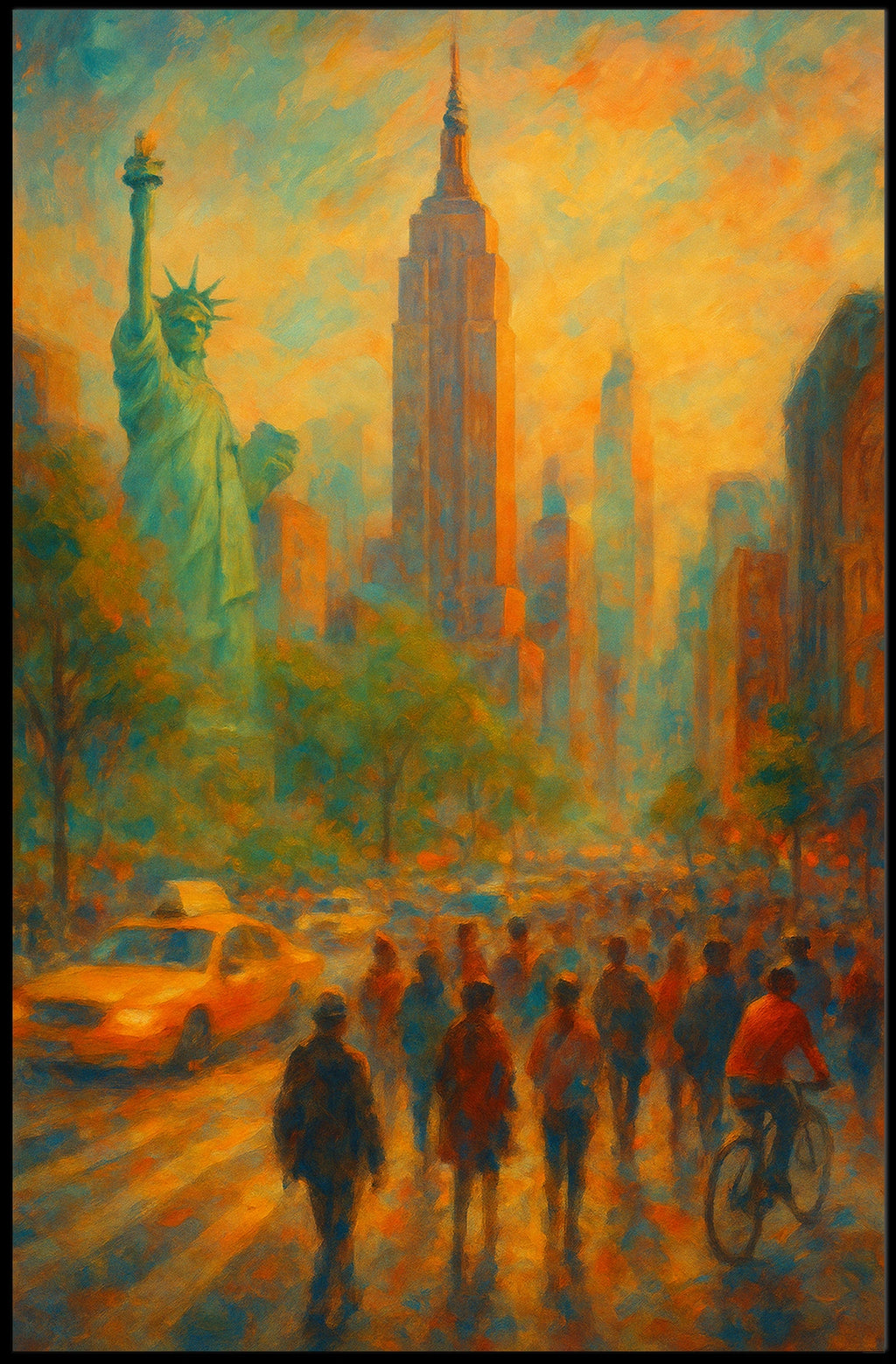 Immerse your walls in the electric energy of New York City with this Vibrant New York Cityscape Impressionist Art Poster. This artwork captures iconic landmarks like the Statue of Liberty and the Empire State Building through bold, luminous brushwork that echoes the city’s hustle.