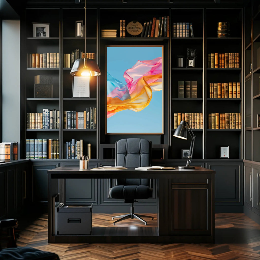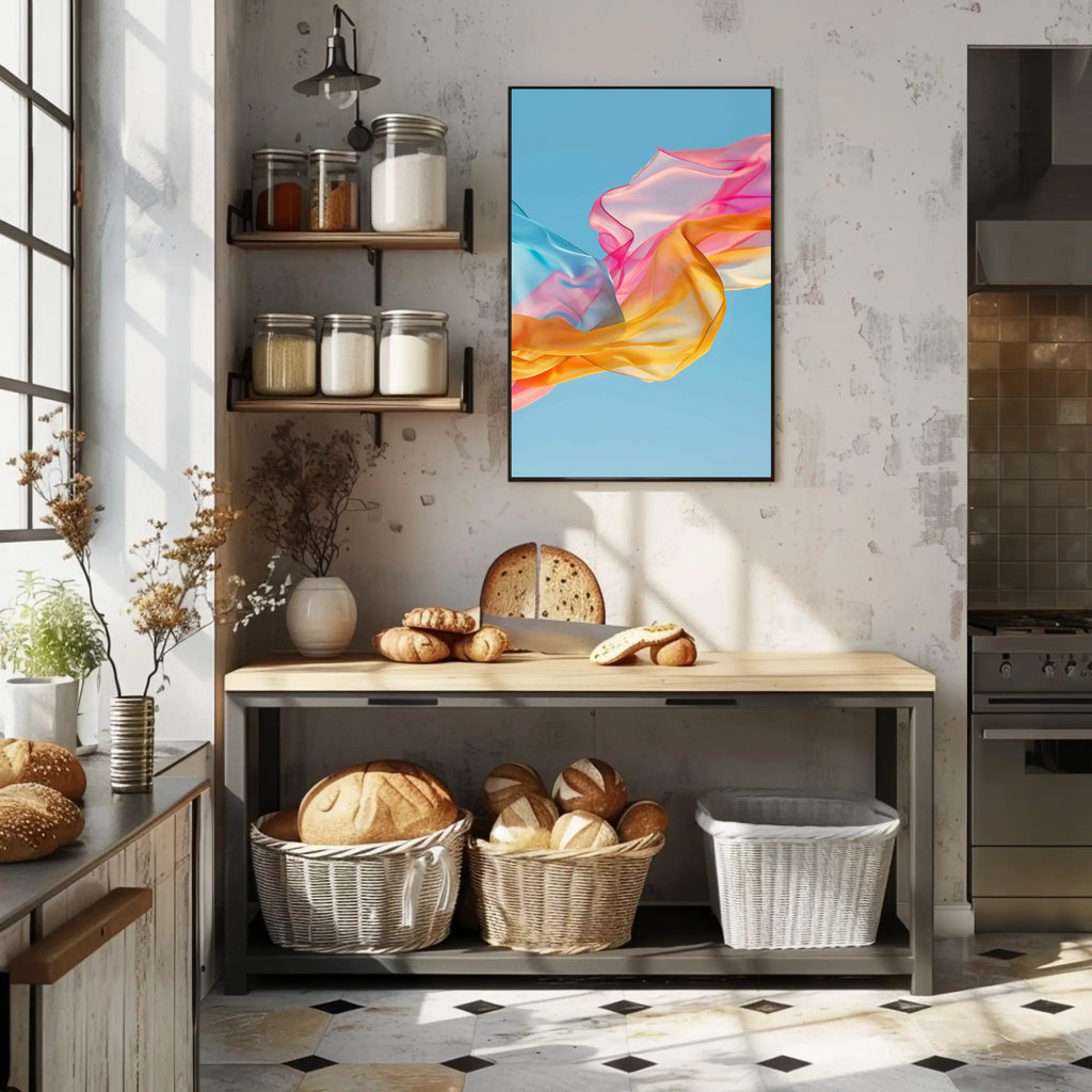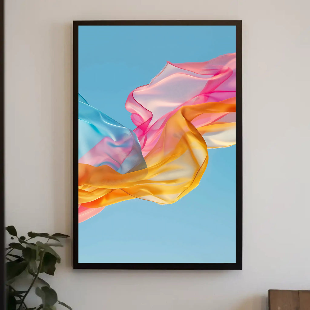 This poster presents a captivating scene of vibrant, flowing, translucent fabrics set against a serene blue sky. In pastel shades of pink, orange, and blue, the fabrics dance with a fluid motion, creating an impression of lightness and elegance. The abstract style captures a beautiful interplay of colors that evoke feelings of freedom and grace, reminiscent of a breezy summer day. Emphasizing movement and tranquility, this modern and minimalist design celebrates harmony and calmness. Perfect for those who appreciate contemporary art, the poster is a testament to the beauty of simplicity and color.