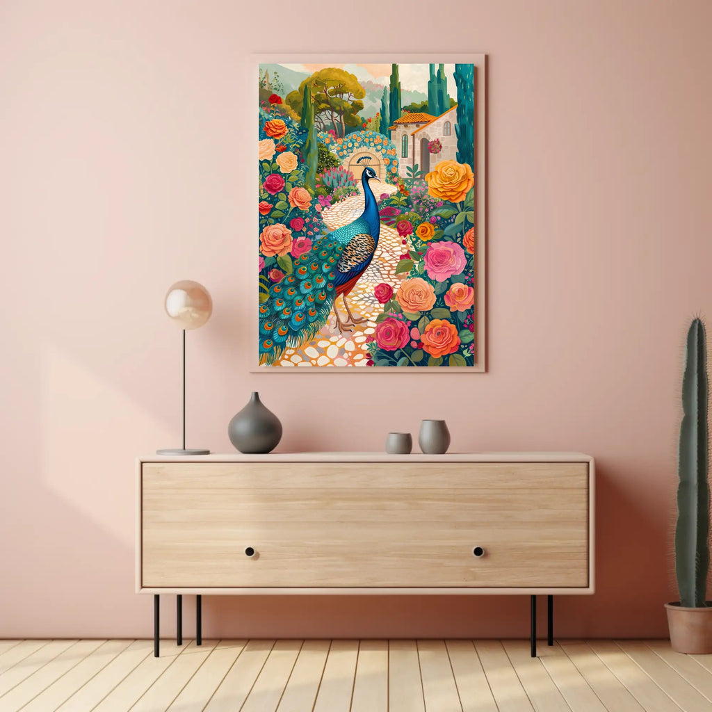 Add a touch of Mediterranean romance and lush greenery to your home — order the Vibrant Peacock Garden Scene Artistic Poster from PosterGoat today and transform your space with botanical elegance.