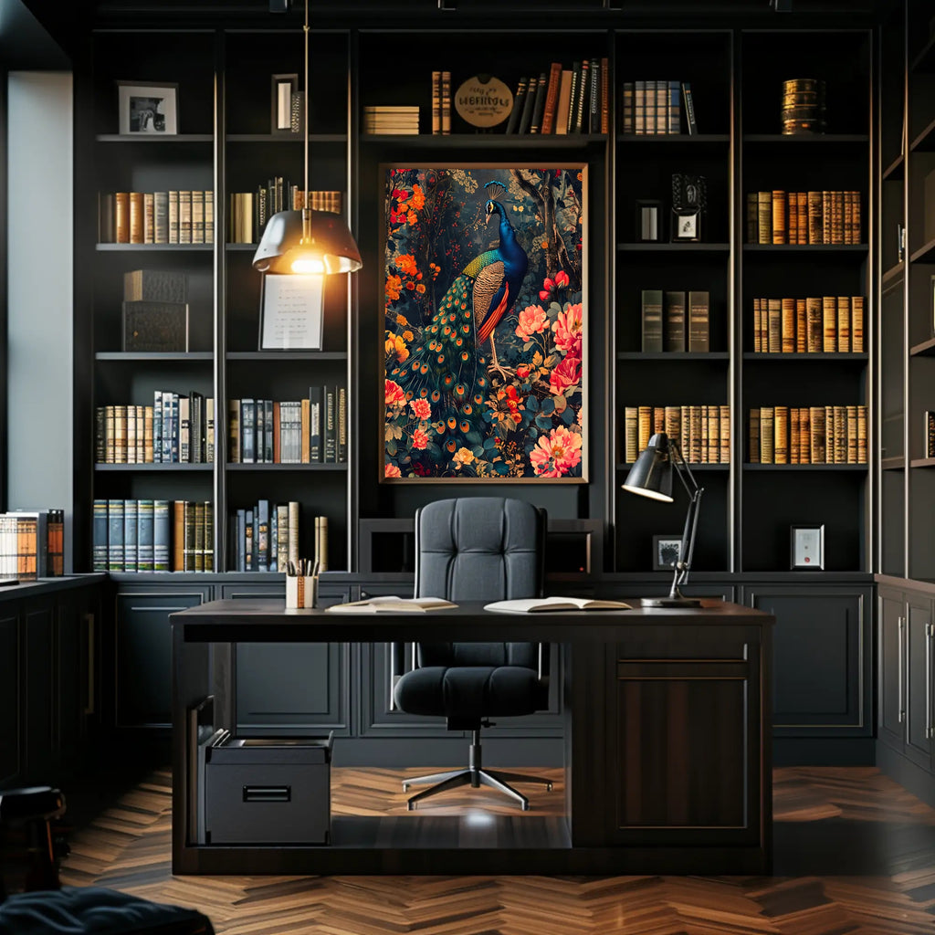 Striking visual impact: Gorgeously detailed peacock feathers with luminous eyespots, layered botanical elements, and high-contrast florals create an instant focal point for living rooms, bedrooms, or entryways.