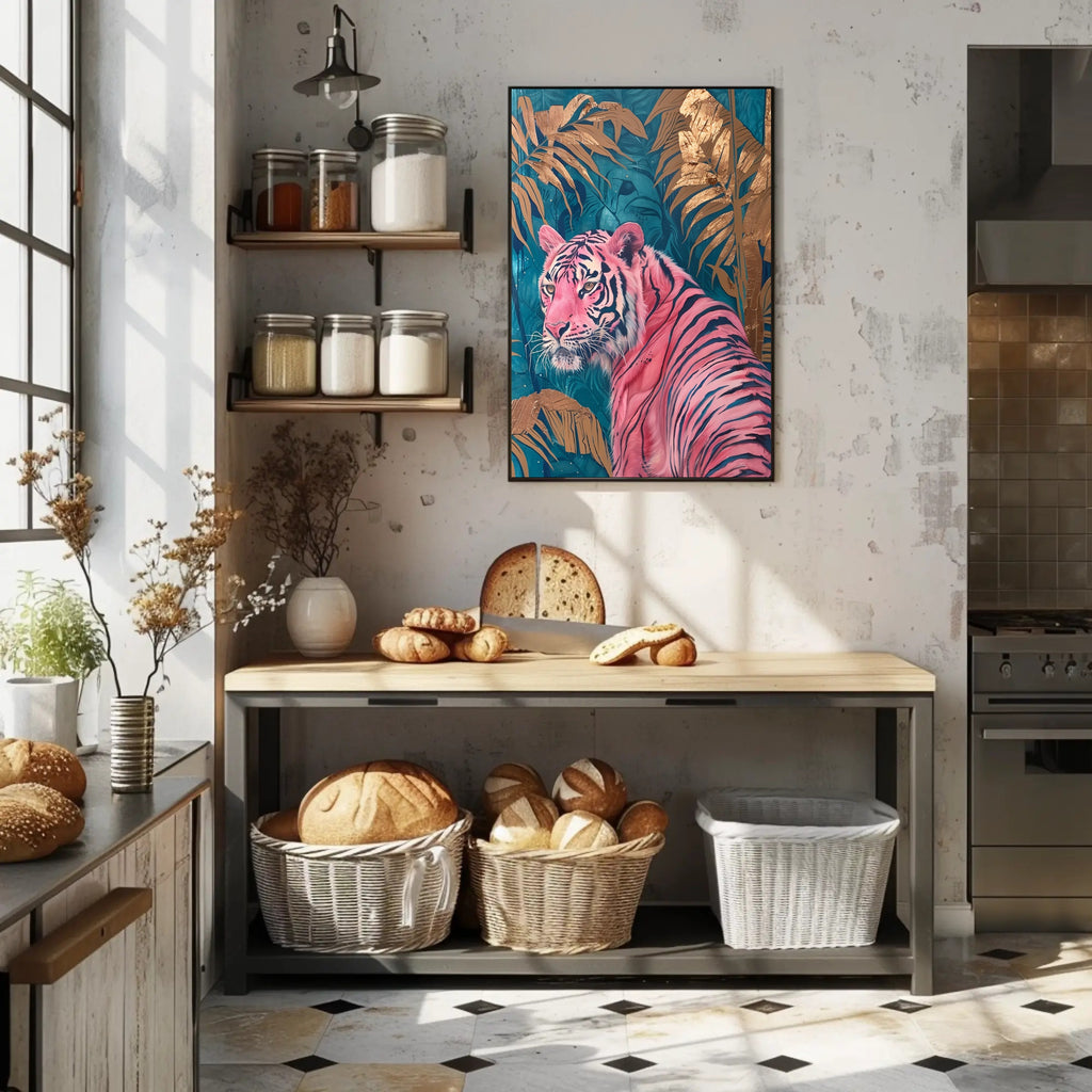 Styling tips: Pair with minimalist frames in black or warm wood to let the pink tiger and gold foliage pop; layer with teal or neutral textiles to tie the room together.
