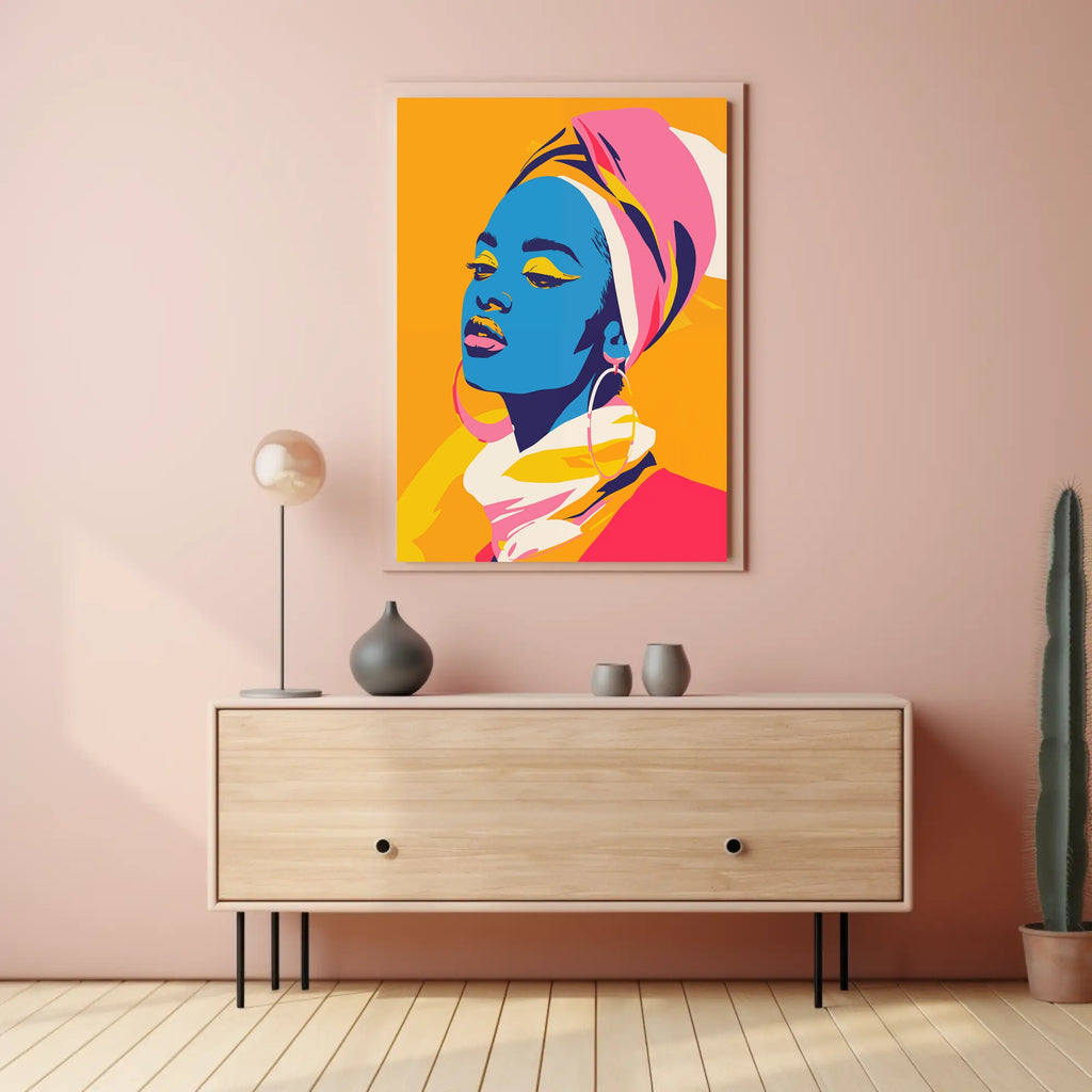 Why you’ll love it: The graphic portrait’s confident expression and modern composition deliver both personality and sophistication — a memorable centerpiece that elevates home art collections and stylish headscarf or woman portrait displays alike.