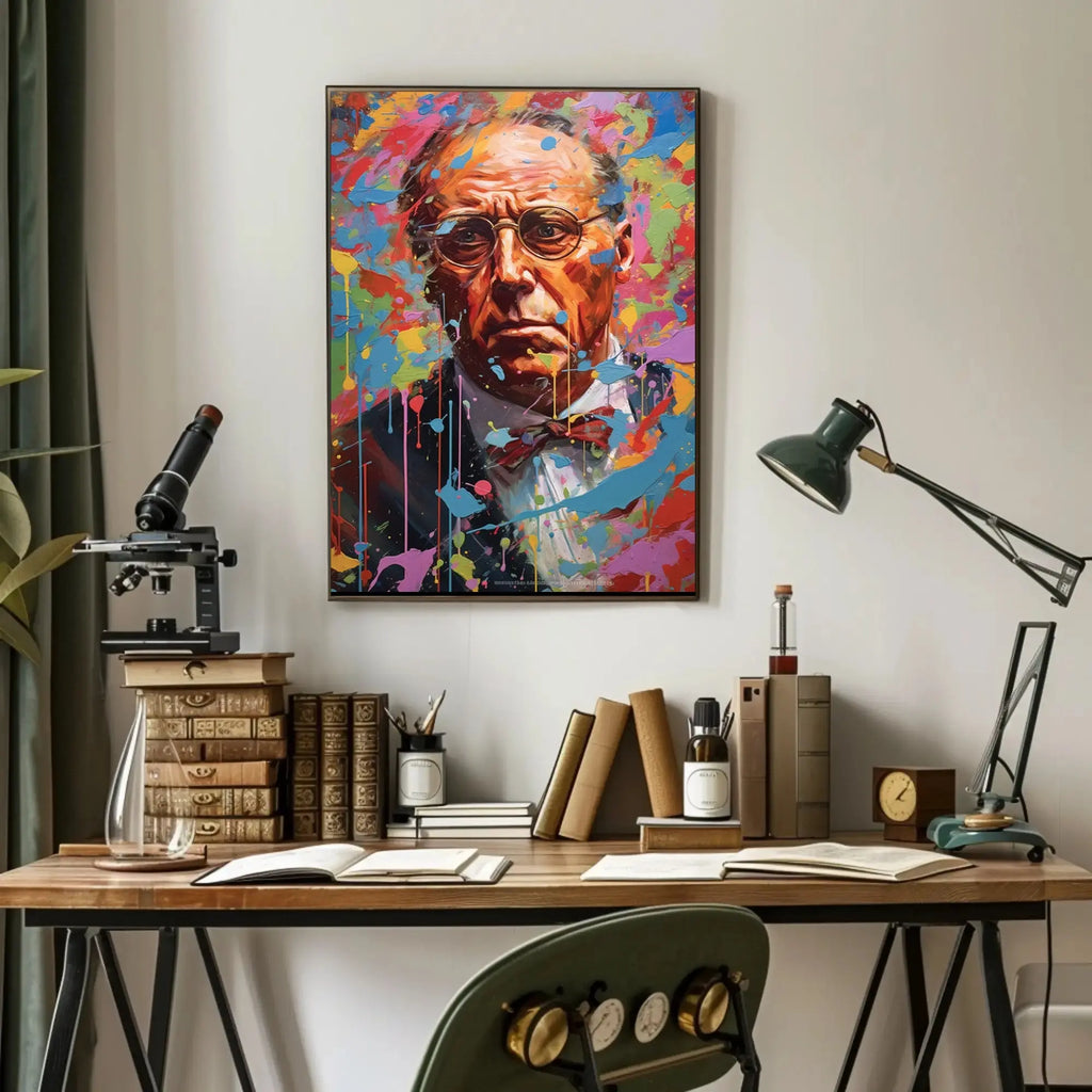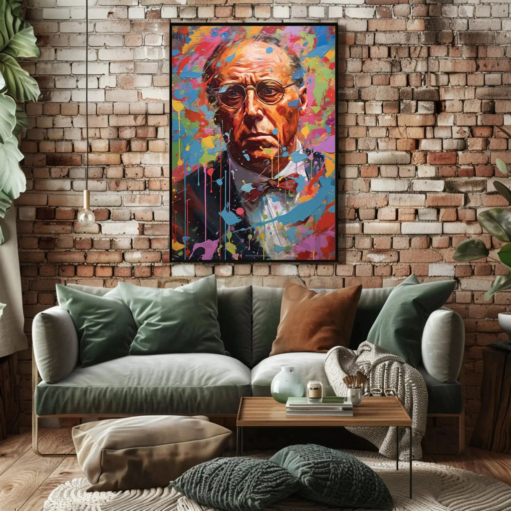 This high-impact poster features a meticulously rendered older man's face framed by explosive, colorful paint splashes and expressive brushstrokes. The juxtaposition of lifelike facial detail (notice the textured skin, thoughtful expression, and classic round glasses) against dynamic drips and color bursts creates an instant conversation starter and a bold focal point for contemporary home or office decor.