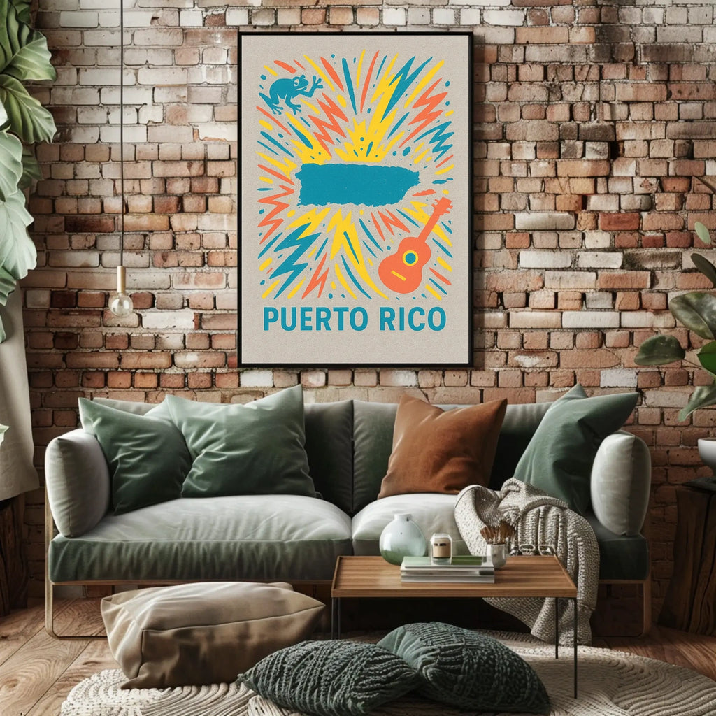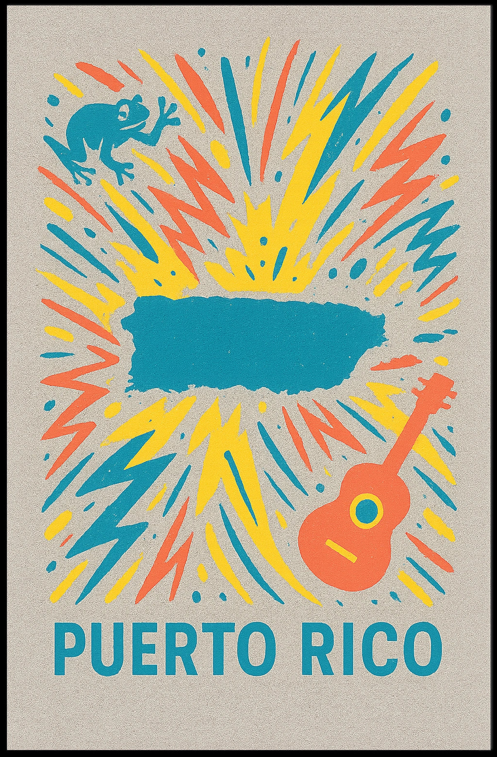 Immerse yourself in the lively essence of Puerto Rico with this vibrant poster, celebrating iconic symbols like the coquí frog and a classic guitar. This energetic design captures the island’s rich cultural heritage and spirited ambiance, making it a perfect addition to any room.
