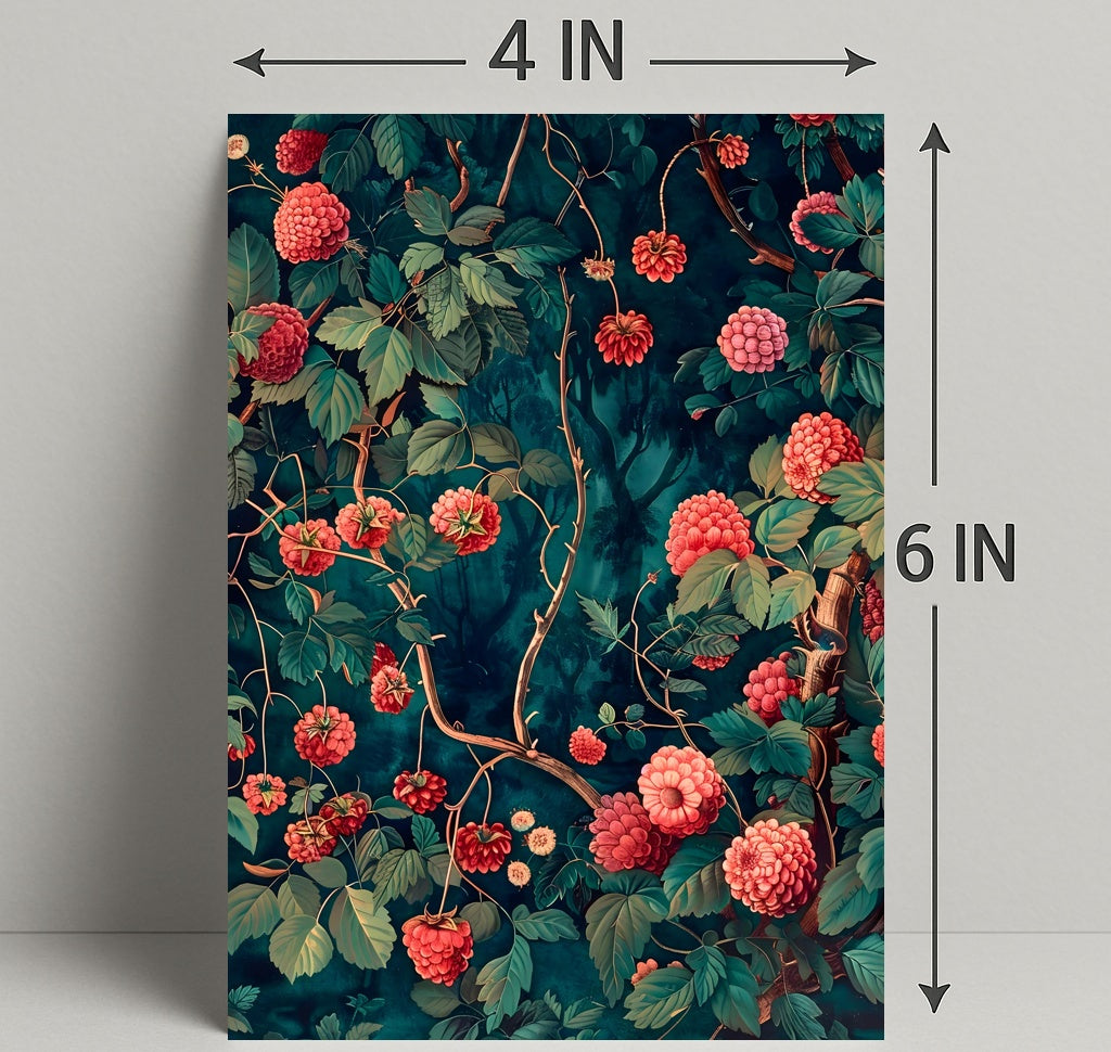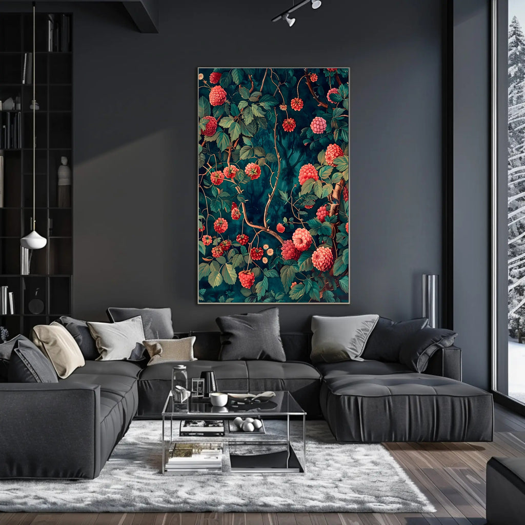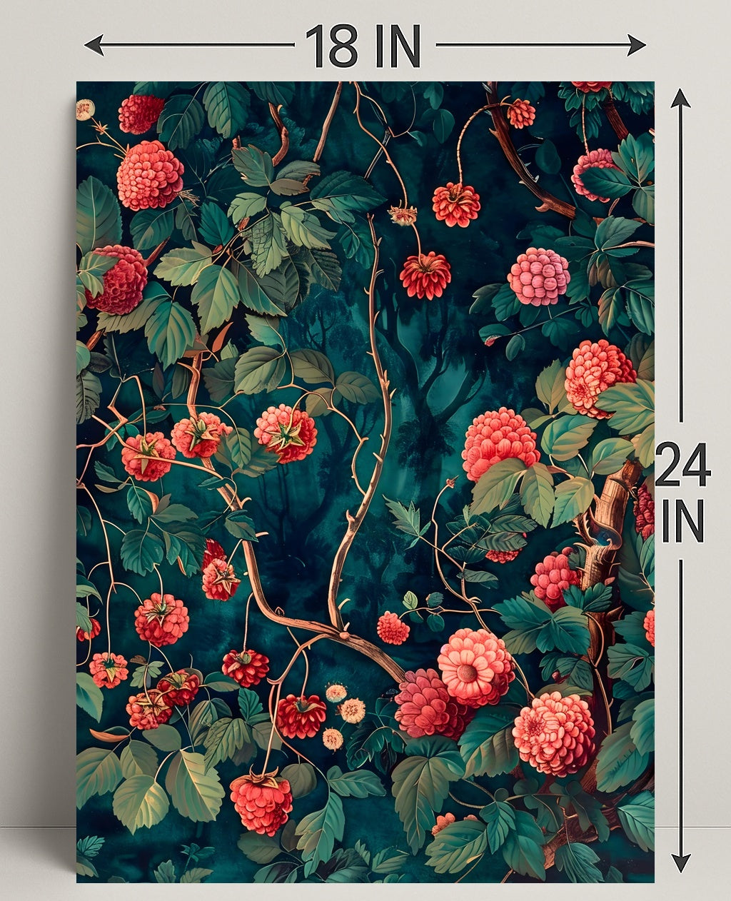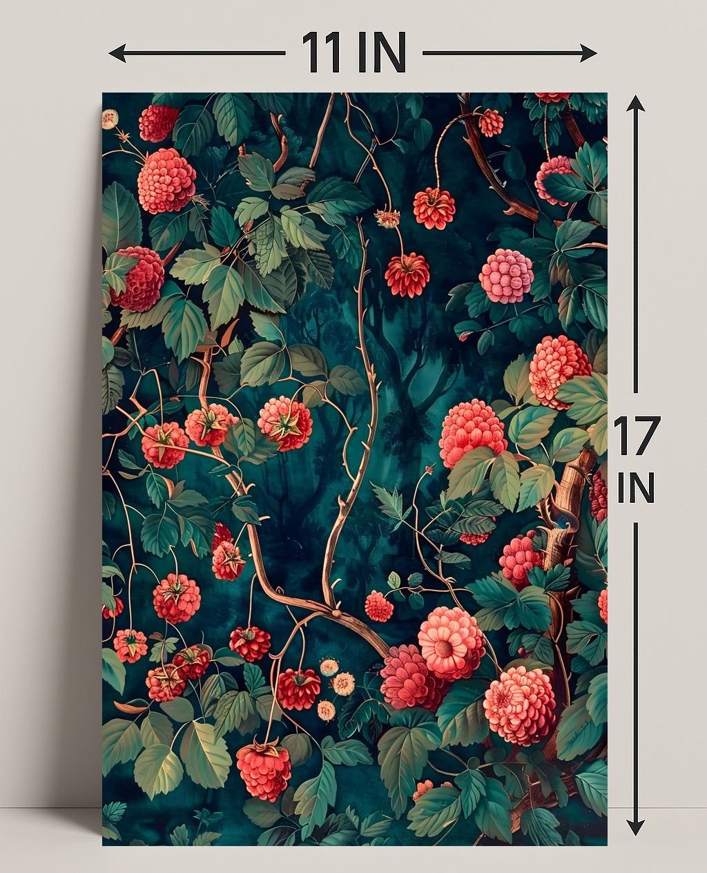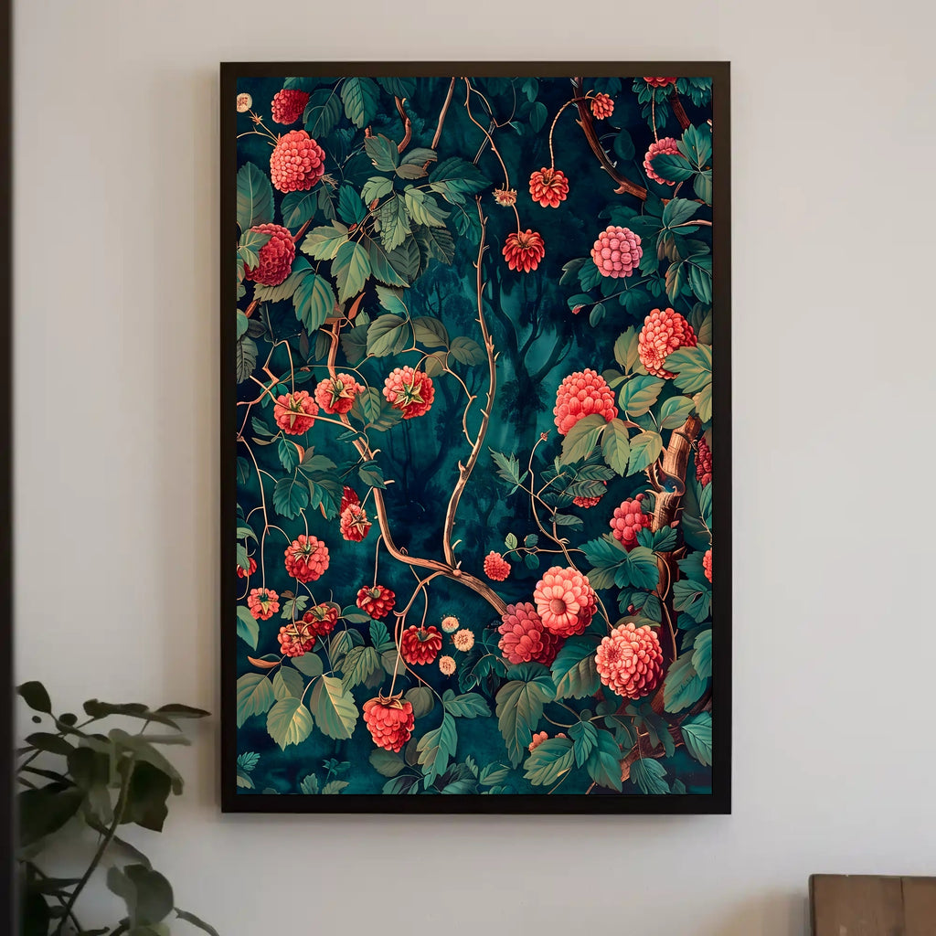 Immerse your room in a lush, jungle-inspired scene with the Vibrant Red Floral Scene Artistic Poster from PosterGoat. This eye-catching poster features jewel-toned teal depths, twisting branches and clusters of round, photorealistic red blooms that pop against richly detailed green foliage — a perfect statement piece for living rooms, bedrooms, or office walls.