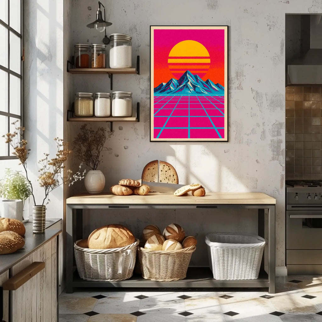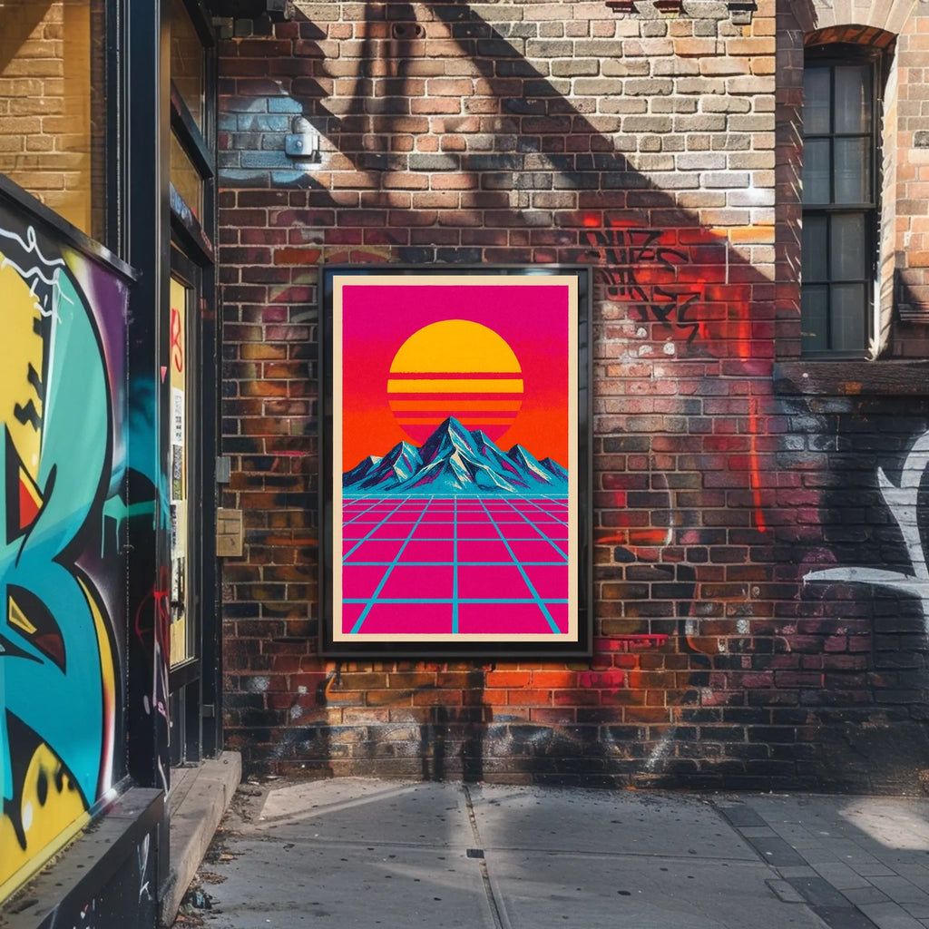 This piece channels the outrun aesthetic and vibrant color contrasts that define 1980s digital art, making it an ideal addition to retro poster collections and modern interiors alike.