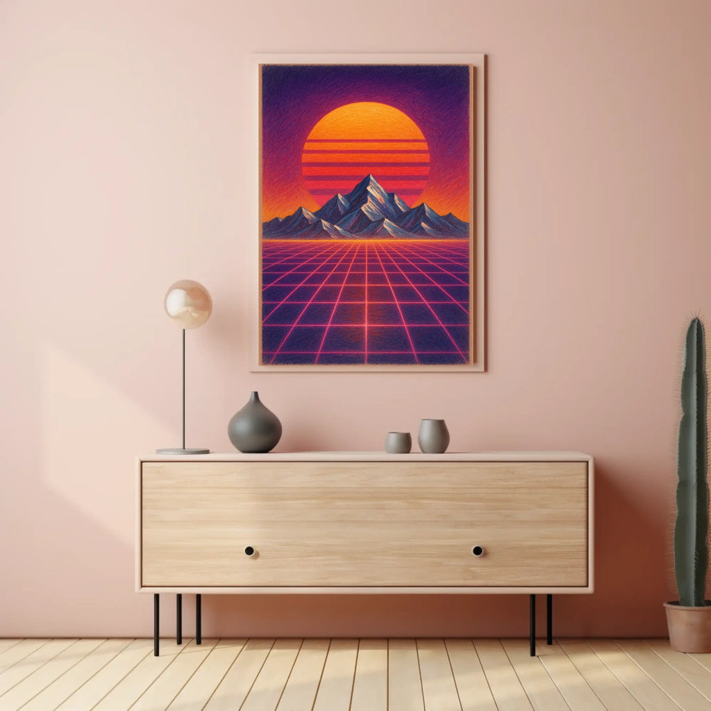 This captivating poster showcases a surreal, fantastical landscape that artfully blends natural and digital elements. In the scene, jagged blue and purple mountains stand defiantly against a vibrant, stylized sunset or sunrise. Dominating the backdrop is a large, stylized sun with distinctive horizontal stripes, casting warm orange and pink hues across the image. A digital-like grid pattern extends through the foreground, reinforcing the retrofuturistic, synthwave aesthetic. This bold piece invites viewers into a dynamic world of nostalgia and futuristic fantasy, perfect for fans of sci-fi landscapes and neon aesthetics.