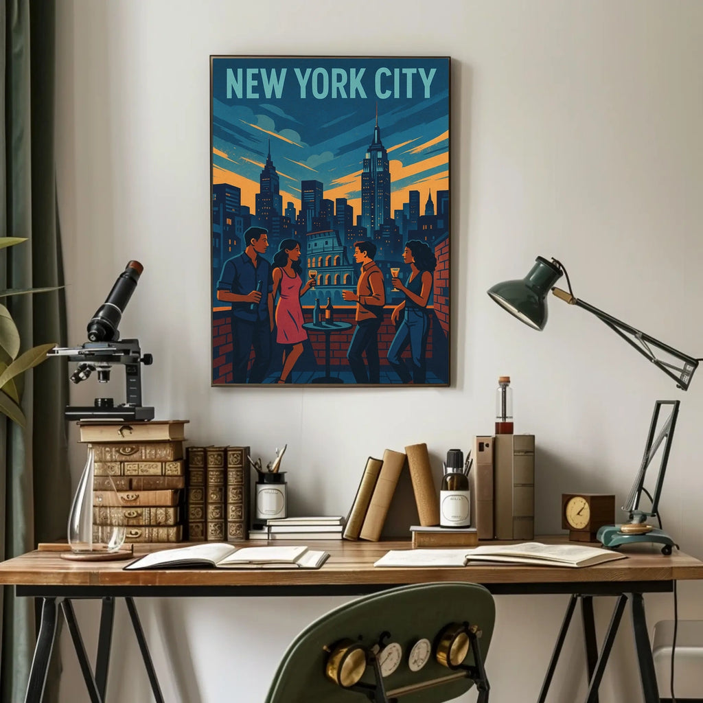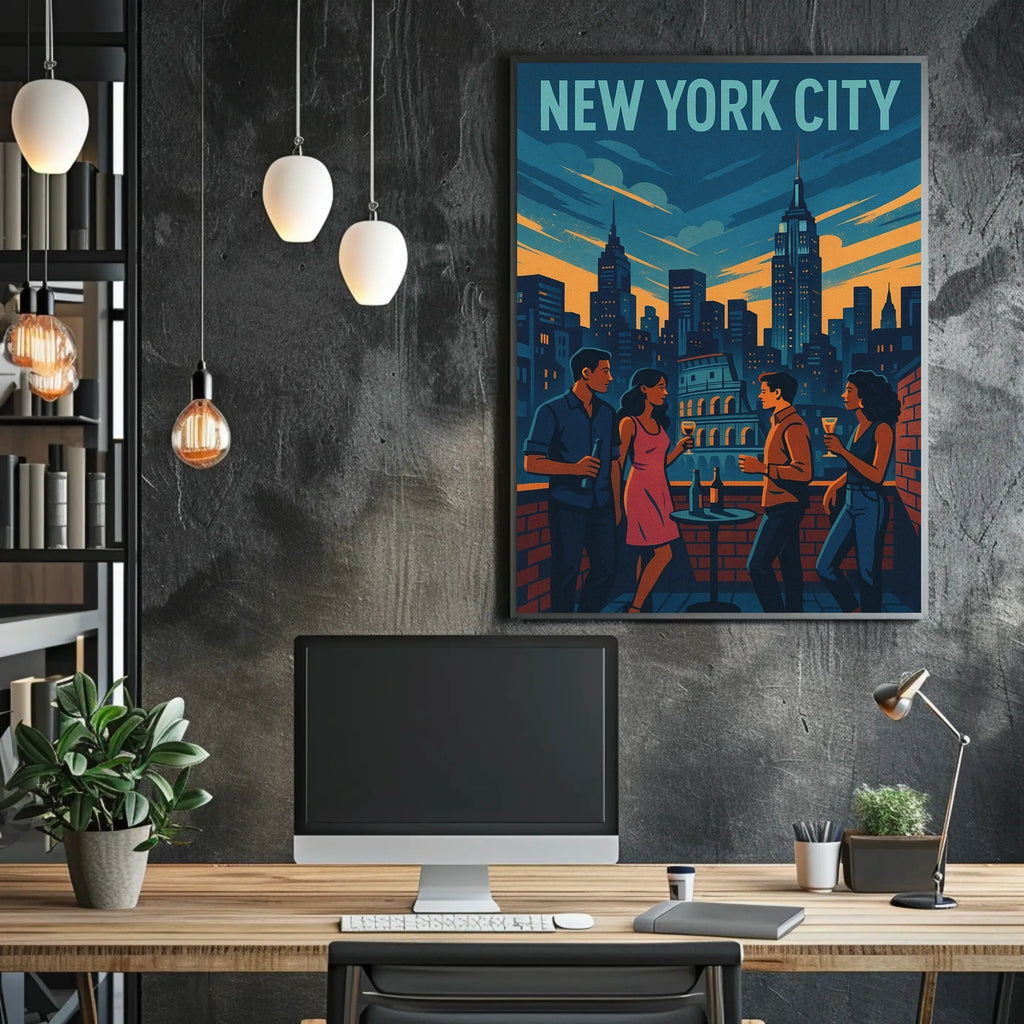 Experience a dynamic poster that captures a polished rooftop scene against a vibrant cityscape inspired by the iconic New York City skyline. This modern illustration exudes cosmopolitan energy and refined sophistication, turning any space into a stylish, nightlife-inspired retreat.