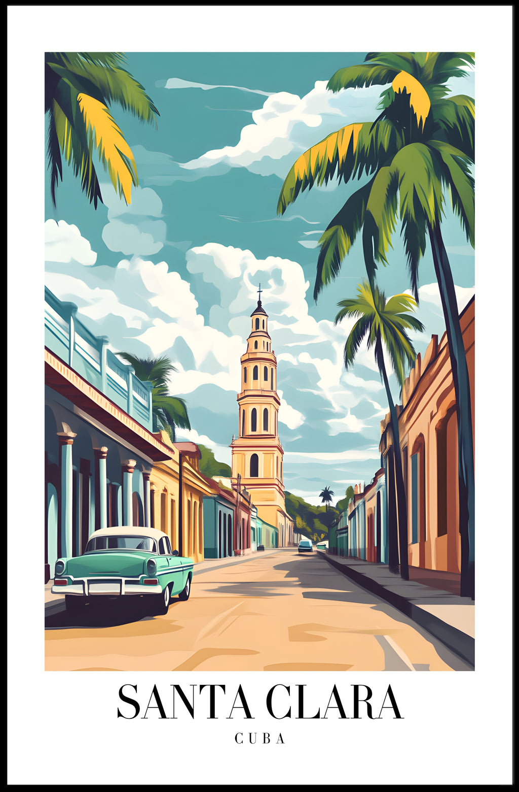 Bring the sun-soaked streets of Santa Clara, Cuba into your home with this Vibrant Santa Clara Street Scene Travel Poster by PosterGoat. Rendered in a bold pop-art style, the print captures pastel-colored colonial facades, swaying palm trees, and an iconic mid‑century vintage car parked beneath a clear tropical sky — all leading the eye toward the town’s distinctive tower for an instant dose of Caribbean charm.