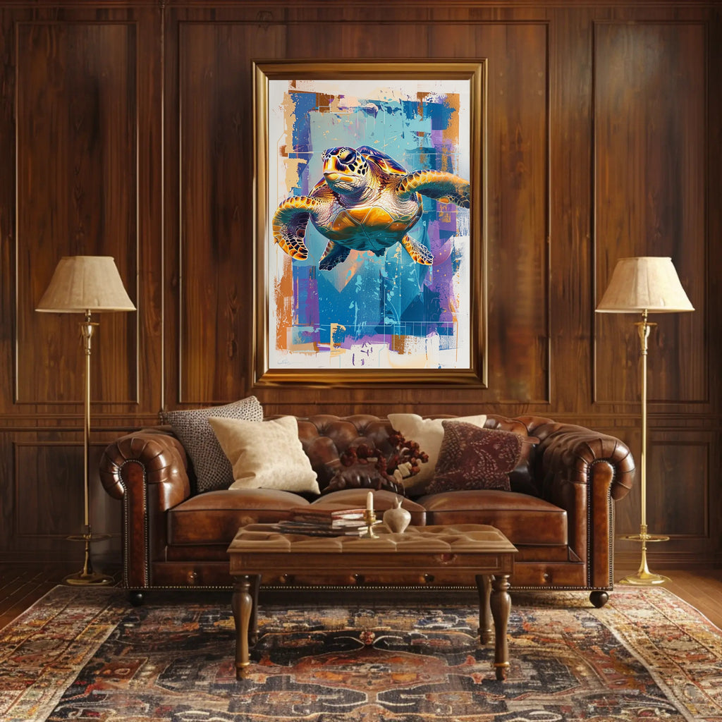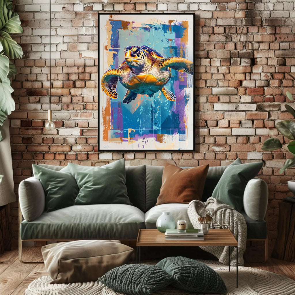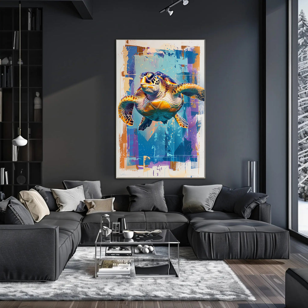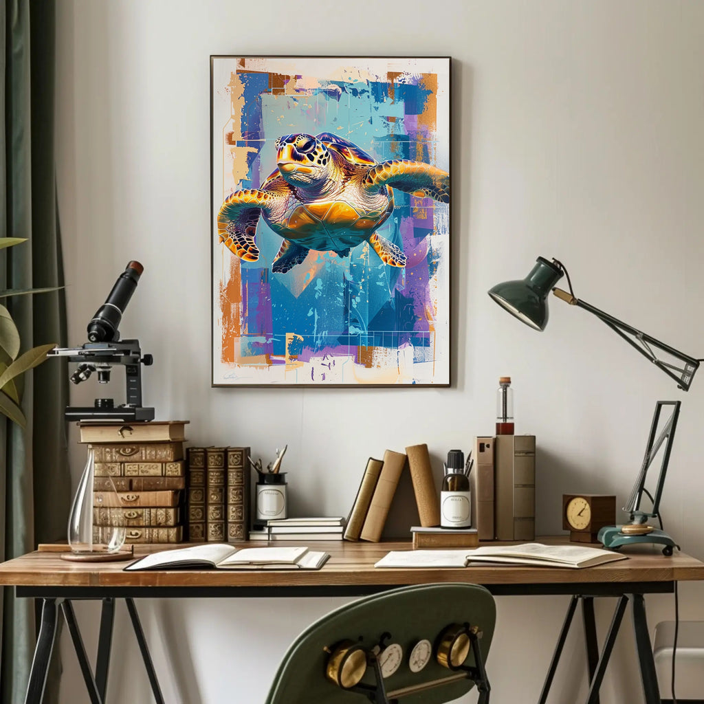 Bring the ocean home with this Vibrant Sea Turtle Art Print Poster from PosterGoat — a bold, pop-art inspired piece that fuses marine realism with colorful abstract textures to create a focal point for any room.