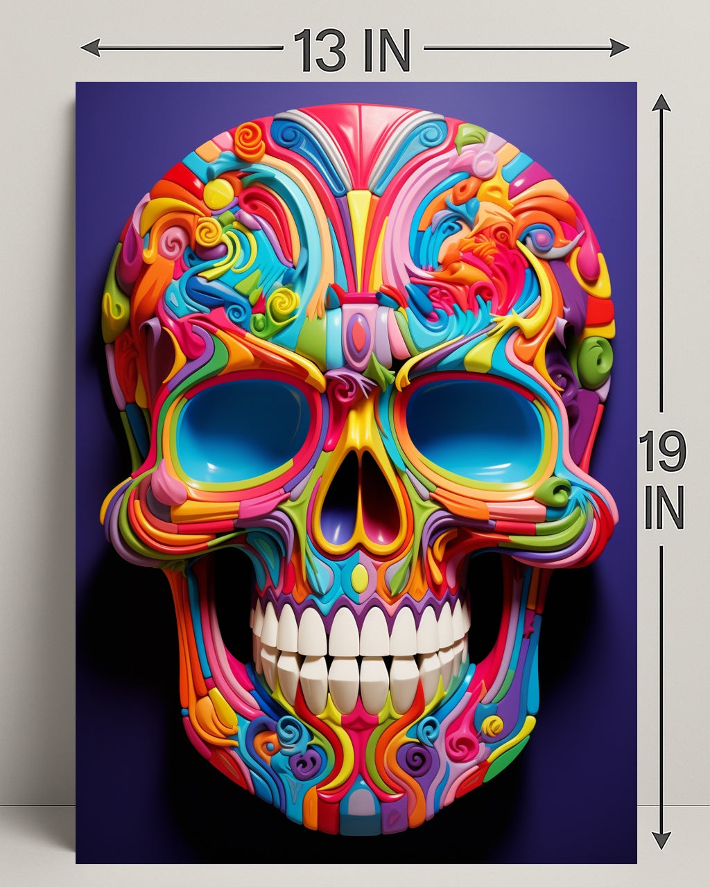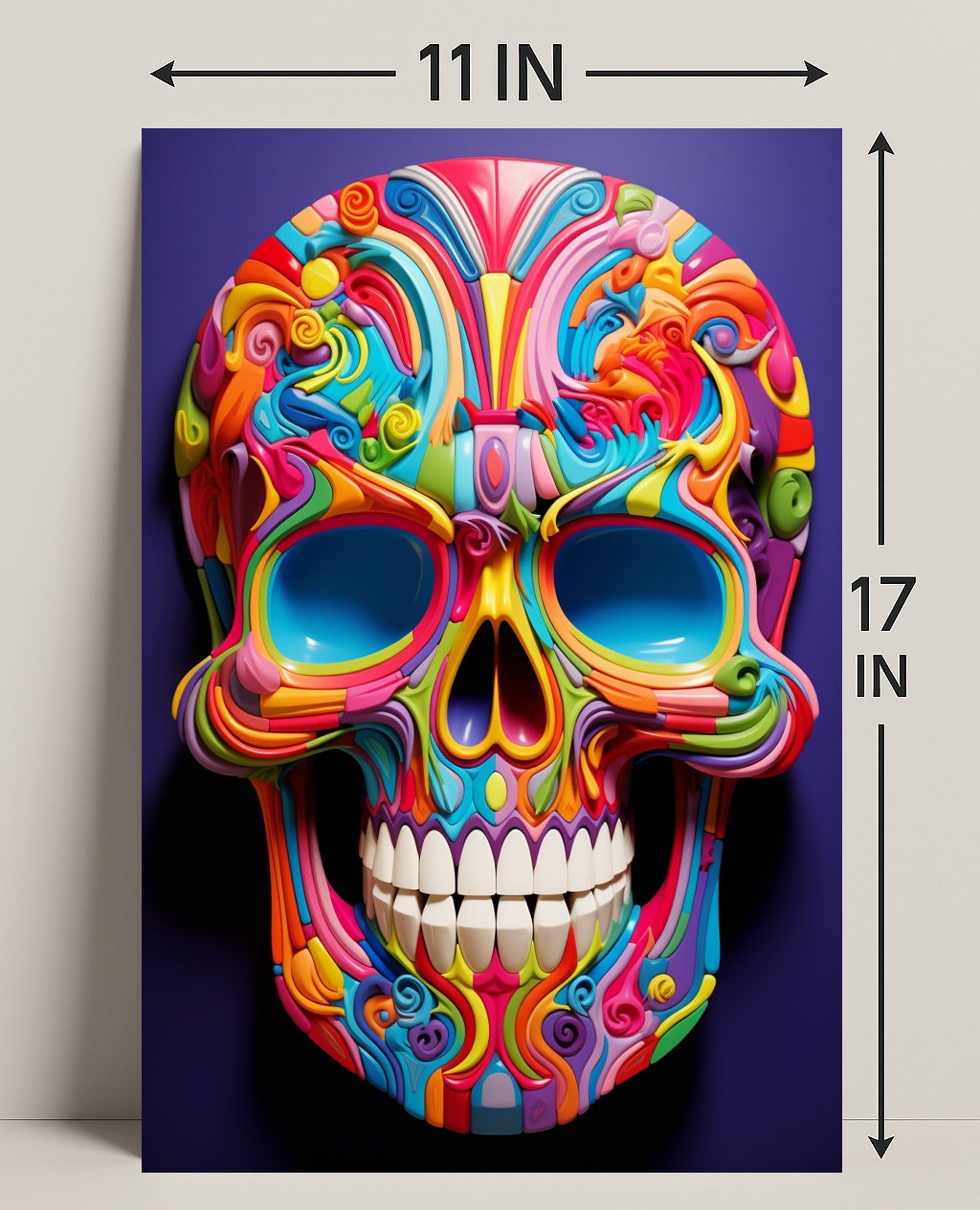 Bring bold, contemporary energy to your walls with the Vibrant Skull Art Poster from PosterGoat. This eye-catching pop-art poster features a high‑contrast, three‑dimensional skull rendered in swirling layers of saturated color, glossy highlights, and sculpted details that leap from a deep purple backdrop—an instant focal point for any modern interior.