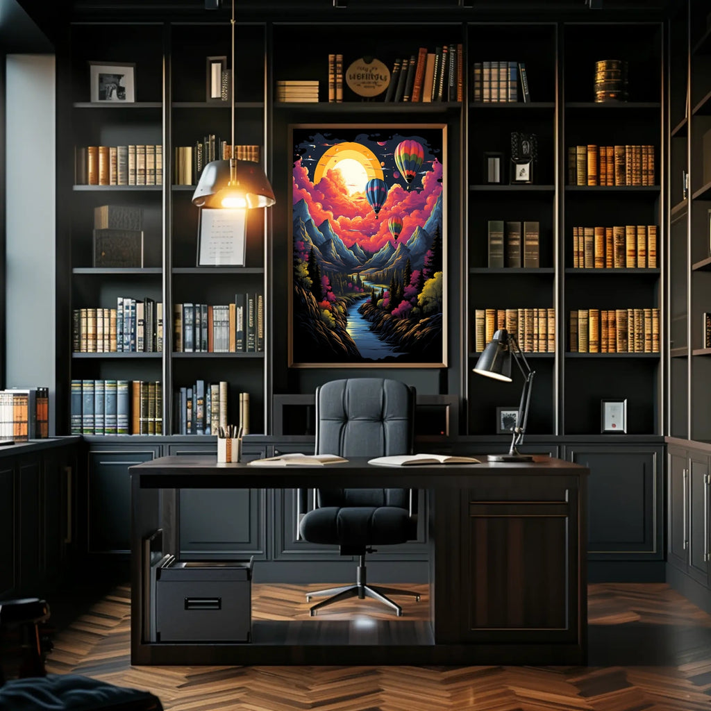 Designed to inspire any space, this artwork serves as vibrant wall decor that pairs perfectly with adventurous, whimsical, and travel-inspired interiors. It’s a true adventure inspiration print and a colorful sky artwork that celebrates the magic of sunrise and sunset. Fans of fantasy nature scenes and surreal realism will appreciate the way the hot air balloons art adds movement and optimism to a scenic river poster.