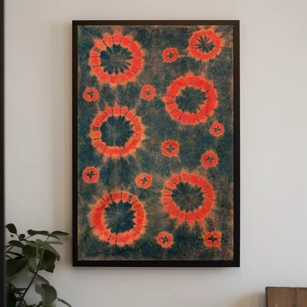 Vibrant Tie-Dye Circles Poster from PosterGoat transforms any room with a bold, rhythmic composition of red and orange circular tie-dye motifs against a deep, dark textured background. The eye-catching arrangement of concentric rings—rendered in vivid, almost glowing hues—creates movement and depth that draw the viewer in, making this poster a striking focal point for modern and eclectic interiors.
