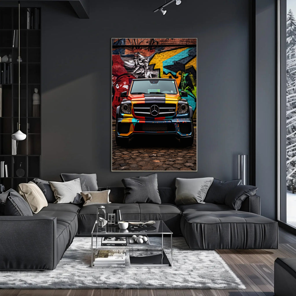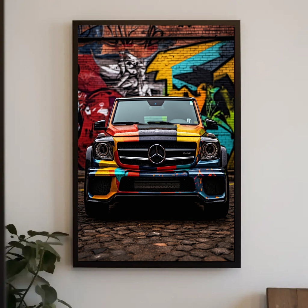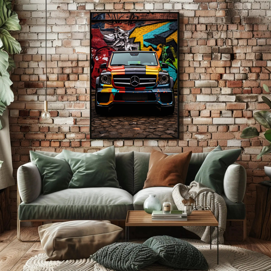 Vibrant Urban Ride Poster — a striking art print from PosterGoat that brings city energy and automotive style to your walls. This 18x24 poster (SKU: CAR-N-036) features a bold, pop-art inspired Mercedes front framed against a richly textured graffiti brick wall and cobblestone street, blending modern design with raw urban scenery.