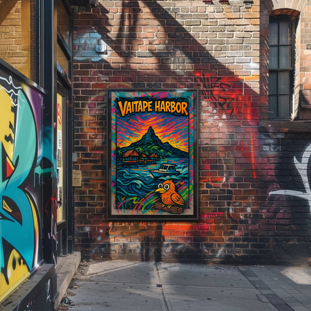 Transport your space to a Polynesian sunset with the Vibrant Vaitape Harbor Travel Poster from PosterGoat — a bold, graffiti-inspired pop art print that blends coastal scenery and whimsical charm. This eye-catching poster depicts a dramatic mountain silhouette, overwater bungalows, a boat cutting across electric waves, and a playful cartoon bird perched in the foreground, all rendered in vivid, saturated hues that pop off the page.