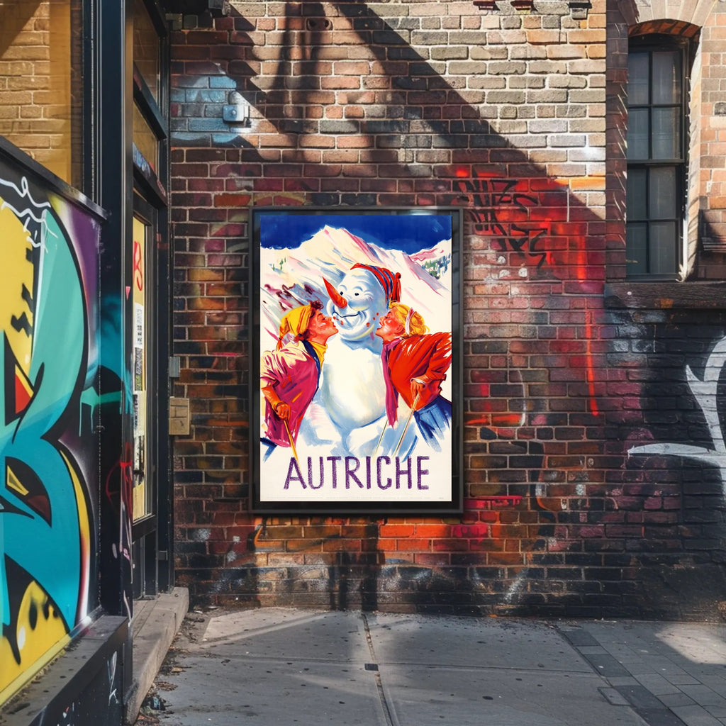 Bring alpine charm and retro travel nostalgia to your walls with this Vibrant Vintage Austrian Winter Scene Travel Poster from PosterGoat. This pop-art style print captures a whimsical snowy moment — two skiers leaning in to kiss a cheerful snowman framed by towering, pastel-hued Austrian mountains — rendered in bold, energetic brushstrokes and saturated color.