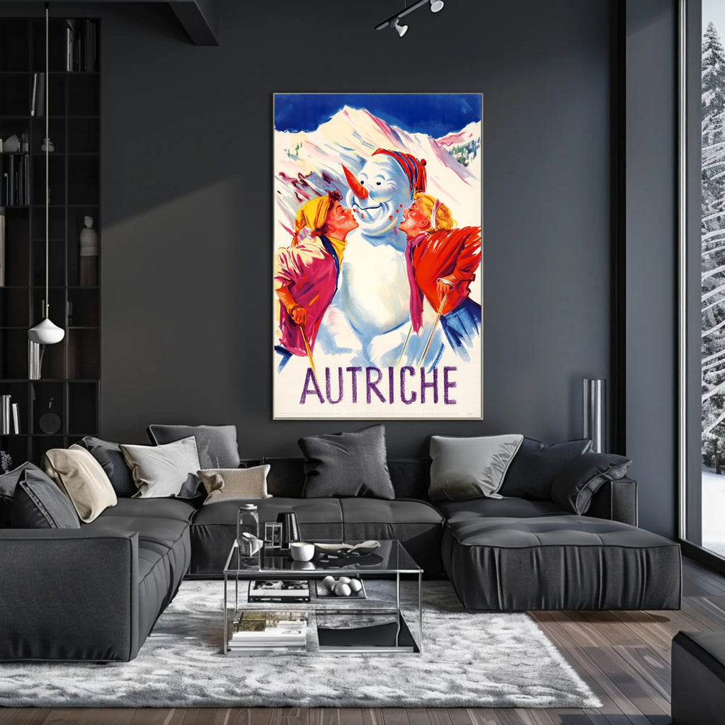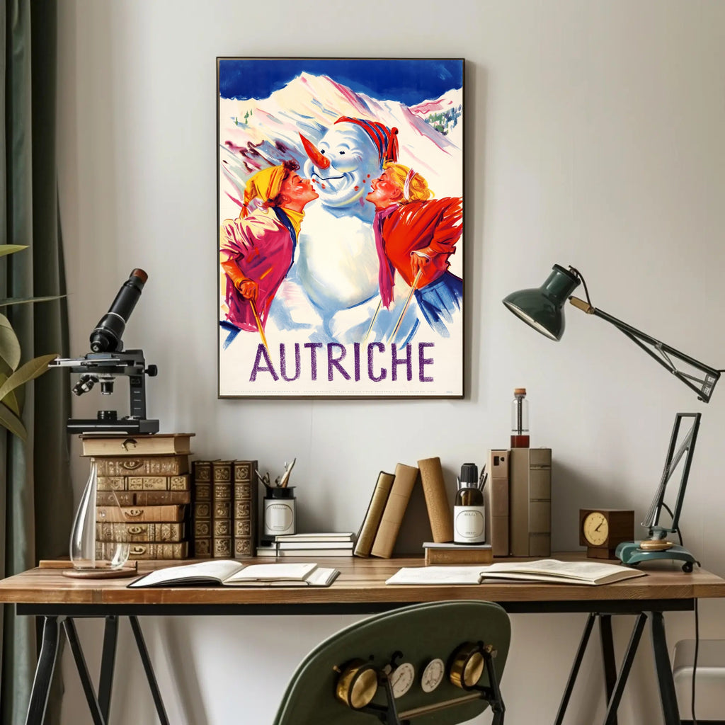 Perfect as a focal point above a console, in a hallway gallery, or as colorful wall decor in a cozy living space, this poster celebrates Austrian winter scenes and festive retro art. The whimsical snowman motif and nostalgic typography make it an ideal gift for ski lovers, lovers of vintage travel art, and holiday décor enthusiasts.