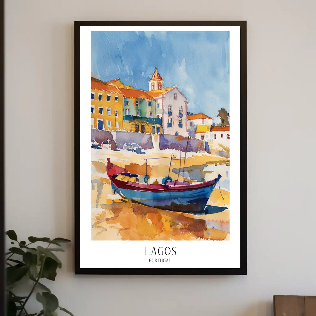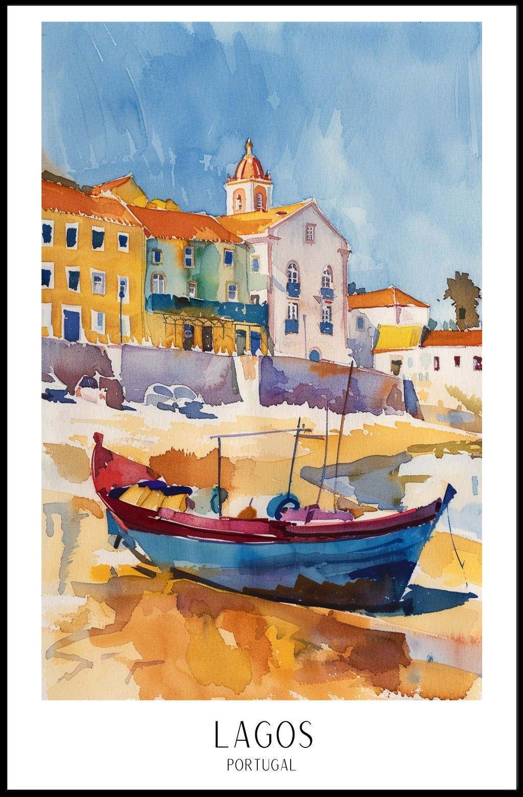 Bring the sun-soaked charm of Lagos, Portugal into your home with this Vibrant Watercolor Coastal Scene Travel Poster from PosterGoat. This modern impressionistic print captures a tranquil seaside moment — a vividly painted boat resting on warm sand in the foreground, with historic European-style buildings and a sunlit church dome rising against a clear blue sky.