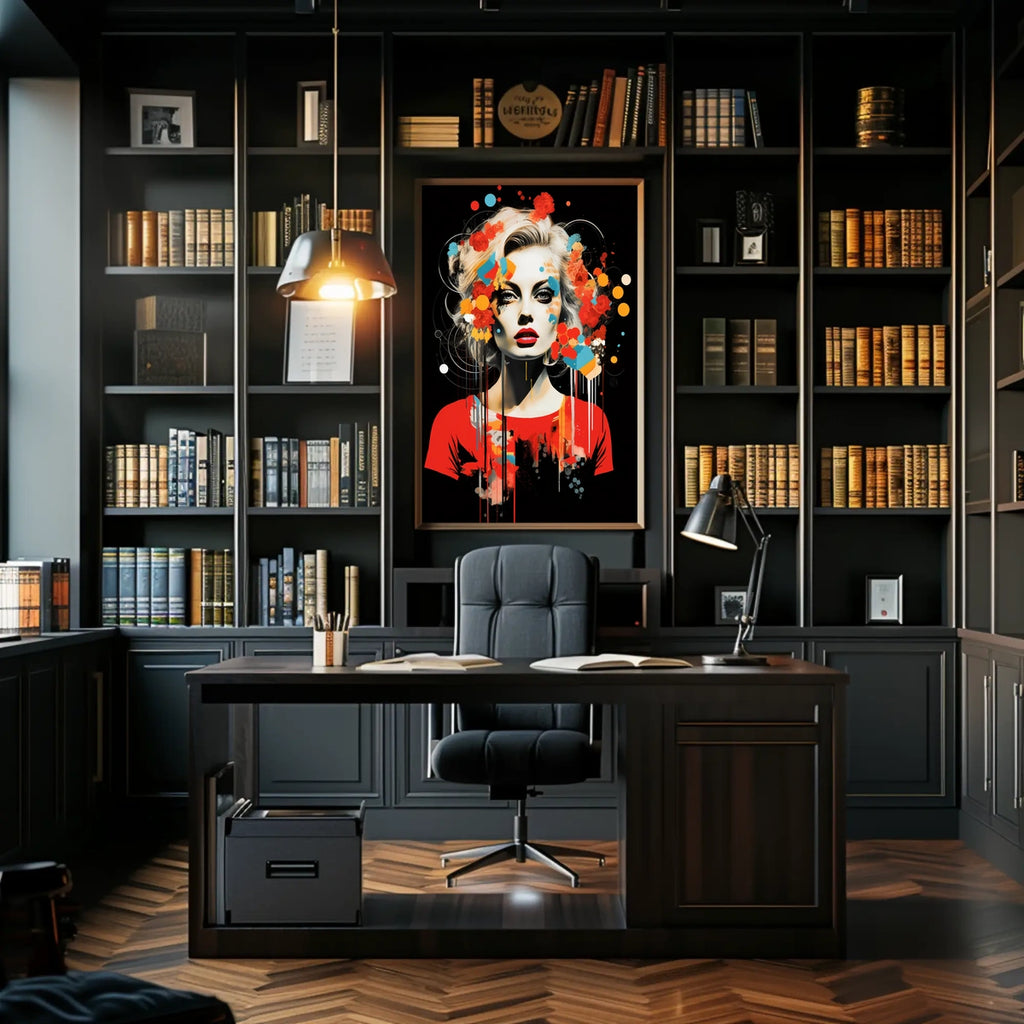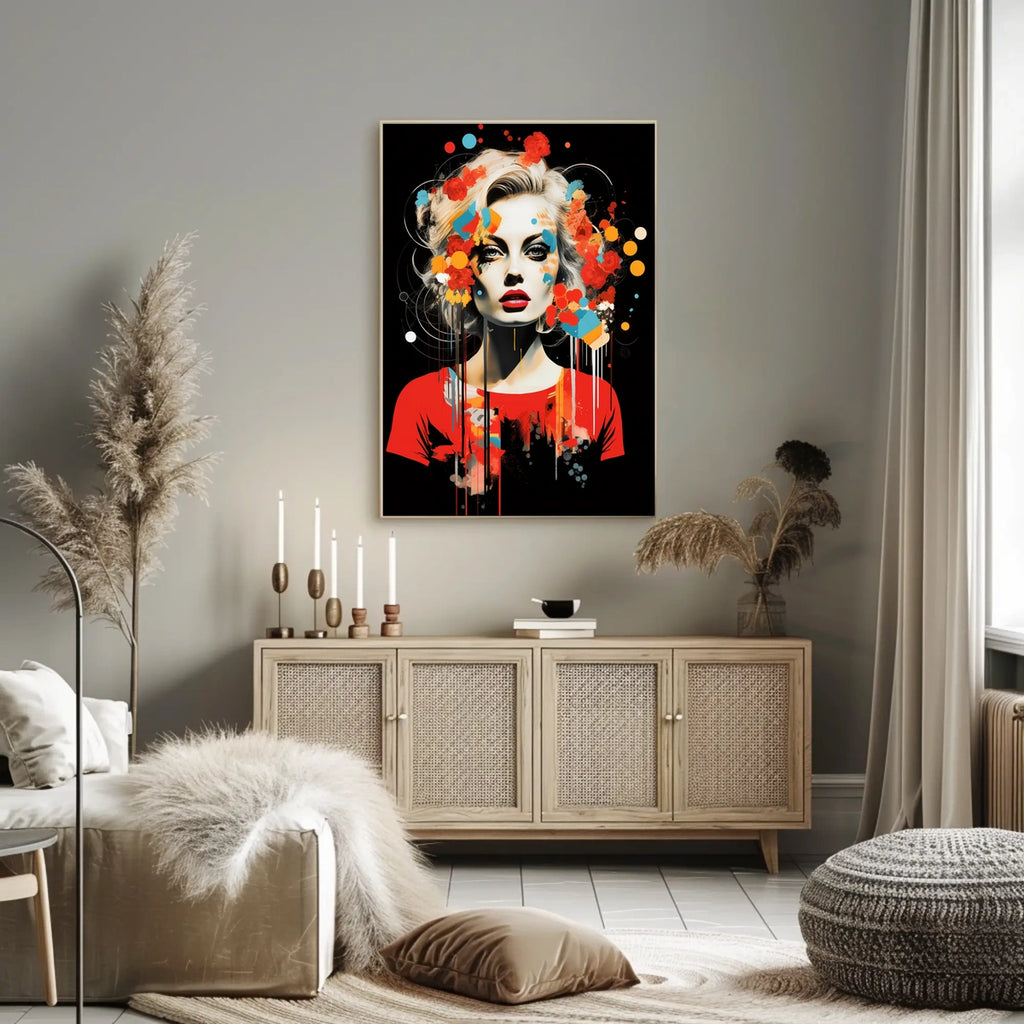 Discover a striking poster that captures the essence of modern artistic expression. This piece features a captivating portrayal of a woman with blonde hair and vibrant makeup, set against a dark background that enhances its surreal, contemporary style. The central figure is surrounded by dynamic abstract elements, including colorful splashes and geometric shapes in bold shades of red, orange, blue, and yellow. This vivid composition marries photorealism with abstract art, making it a bold representation of individuality and creativity. Perfect for lovers of modern aesthetics and expressive décor. This abstract art poster showcases abstract woman art with bold wall art vibes, ideal for fans of photorealistic art and surreal art print aesthetics.